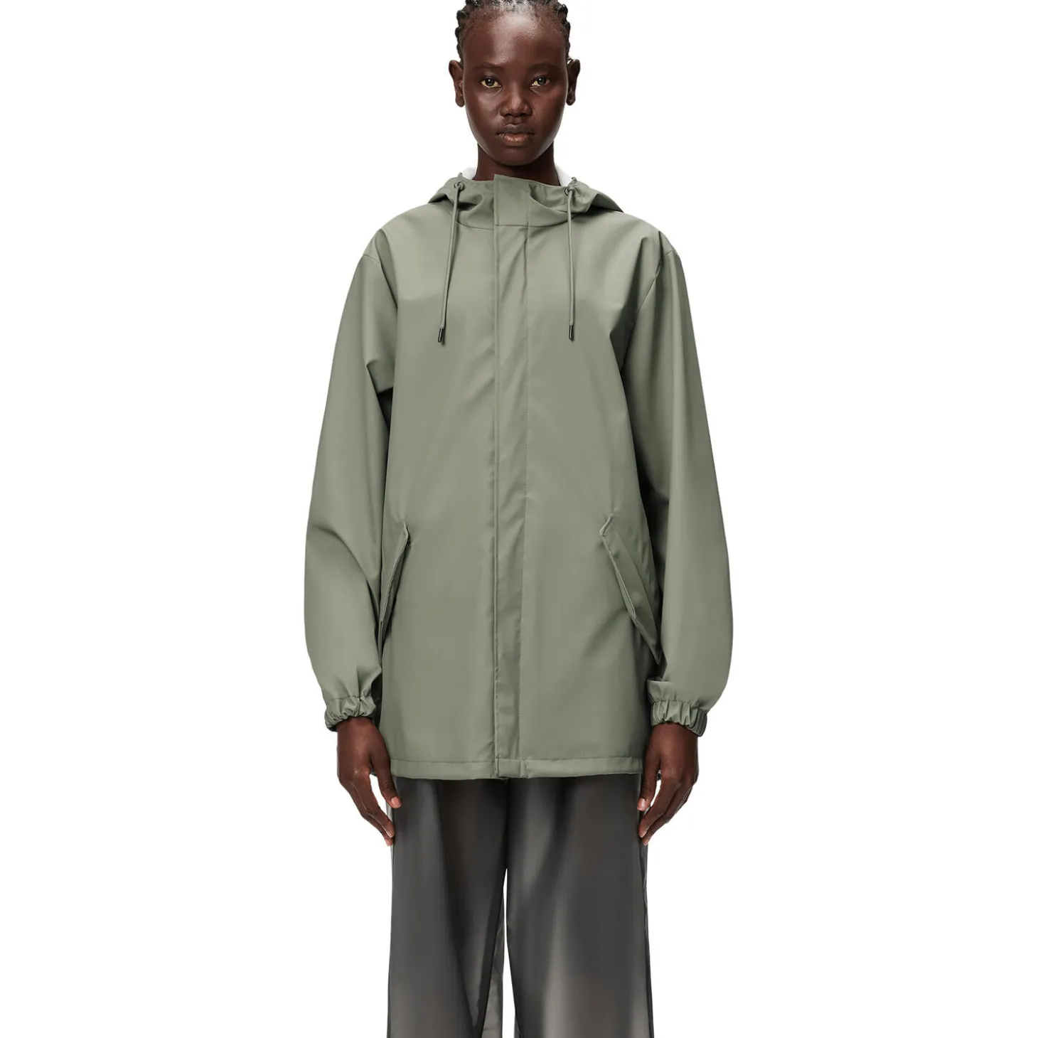 Fishtail Jacket er en unisex regnfrakke. Den er kendetegnet ved sin enkle æstetik og fishtail-kanten med snøre. Dette design har brugsinspirerede lommer, ventileret rygstykke og en hætte med indbygget hætte og snøre. Modellen er afsluttet med elastiske manchetter, der giver en tættere pasform omkring håndleddet. Fishtail Jacket har en afslappet pasform med et elegant fald, som gør den til en oplagt regnfrakke til den daglige pendling. Den belagte lynlås er skjult af en stolpelukning med trykknapper. Regnjakken er skåret i Rains’ karakteristiske PU-stof og har svejsede sømme. Finishen er let og føles blød.