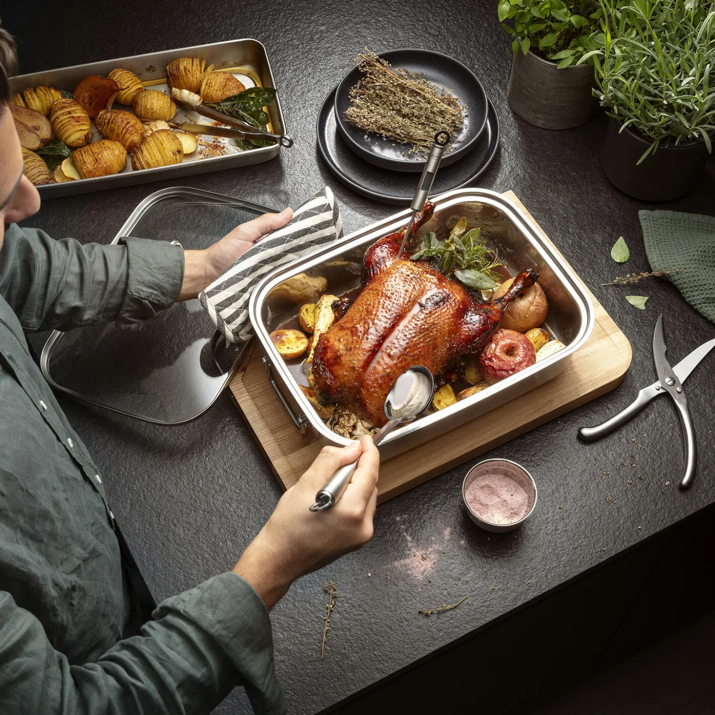 Fjerkræsaks i rustfrit stål gør arbejdet med fjerkræ lettere og mere effektivt. Det skarpe skær med takker og den indbyggede benknuser gør det muligt at håndtere selv de mest krævende dele af fjerkræet. Fjerkræsaksen er udstyret med et ergonomisk håndtag, der ligger perfekt i hånden – uanset om du er højre- eller venstrehåndet. Kan nemt låses med én hånd for sikker og pladsbesparende opbevaring. Håndopvask anbefales.