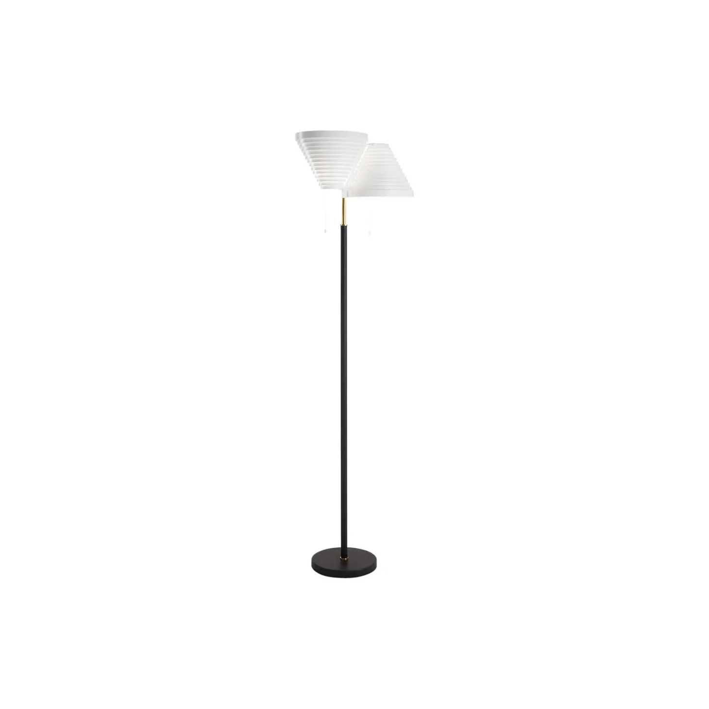 This popular floor light features two hand-riveted shades, each formed from delicate, lacquered metal strips. Together they present a striking combination of lines and curves and allow for an interesting interplay of direct and indirect light. The stand is finished in hand-sewn black leather, while the neck has a polished brass collar. Floor Light A810 was created by Alvar Aalto in 1959 for the National Pensions Institute, Helsinki.