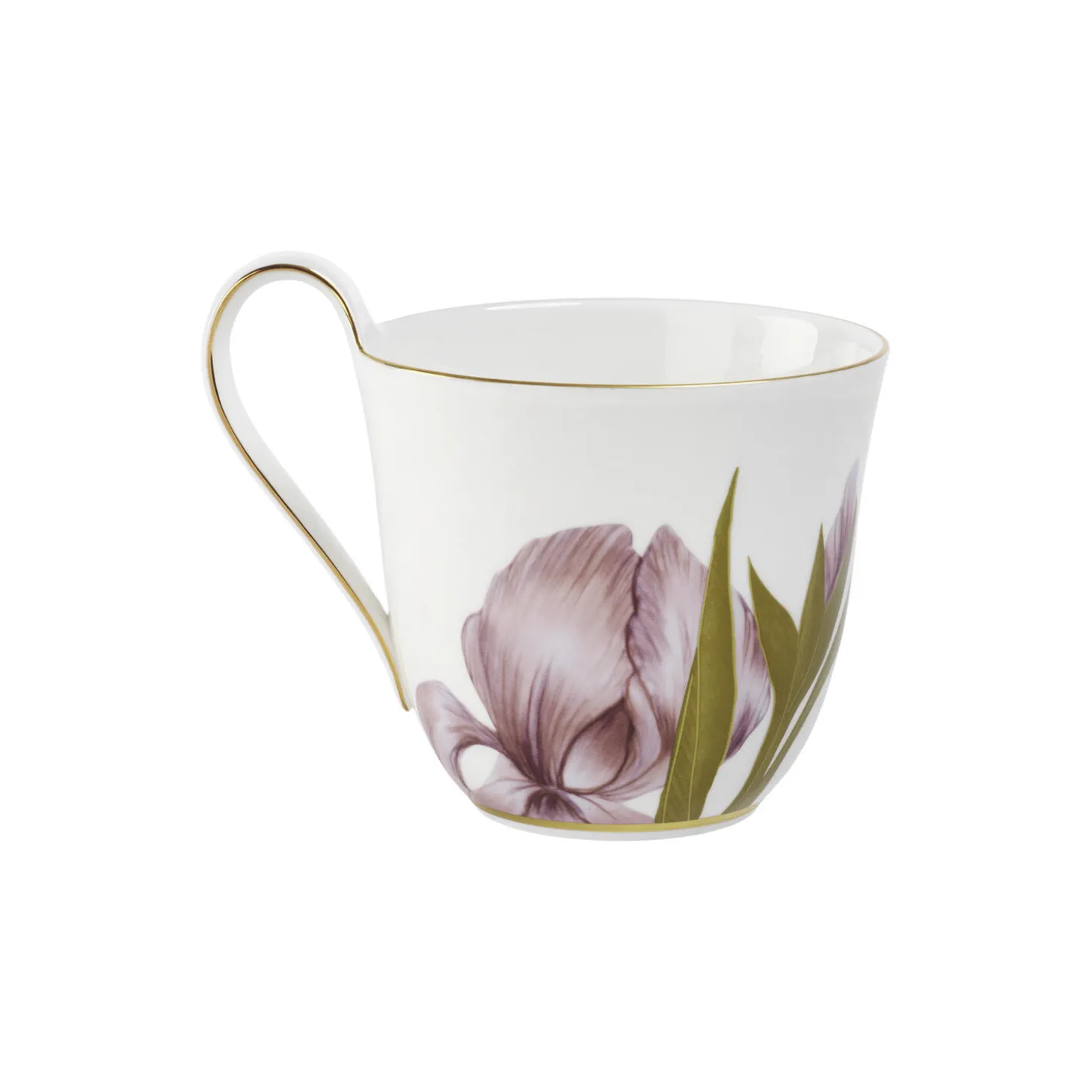 Flora højhankskop, iris i benporcelæn fra Royal Copenhagen. I bløde nuancer af lilla folder irissen sine betagende blade ud på Flora højhankskoppen og akkompagneres af fine, gyldne blade. Den smukke kop er også dekoreret med delikate gulddetaljer langs sine kanter og hanken. Højhankskoppen på 33 cl er ideel til rolige øjeblikke i selskab med te eller kaffe.