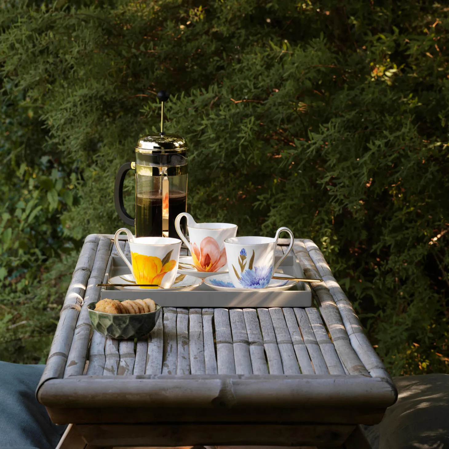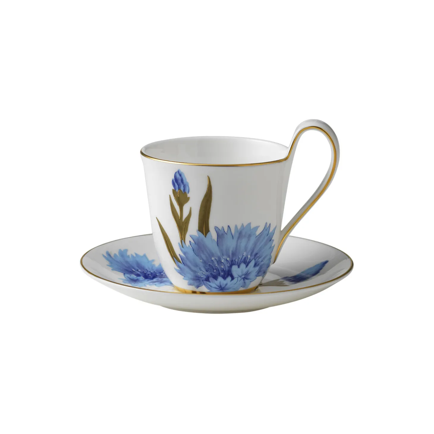 Flora højhankskop med underkop i benporcelæn med kornblomst motiv fra Royal Copenhagen. En frodig kornblomst spreder sine smukke, blå kronblade, og enkelte knopper vokser sig store og springer snart ud i fuldt flor på denne 27 cl Flora Højhankskop og underkop. Kombinér koppen med andre dele fra Flora-stellet for et romantisk blomsterflor.