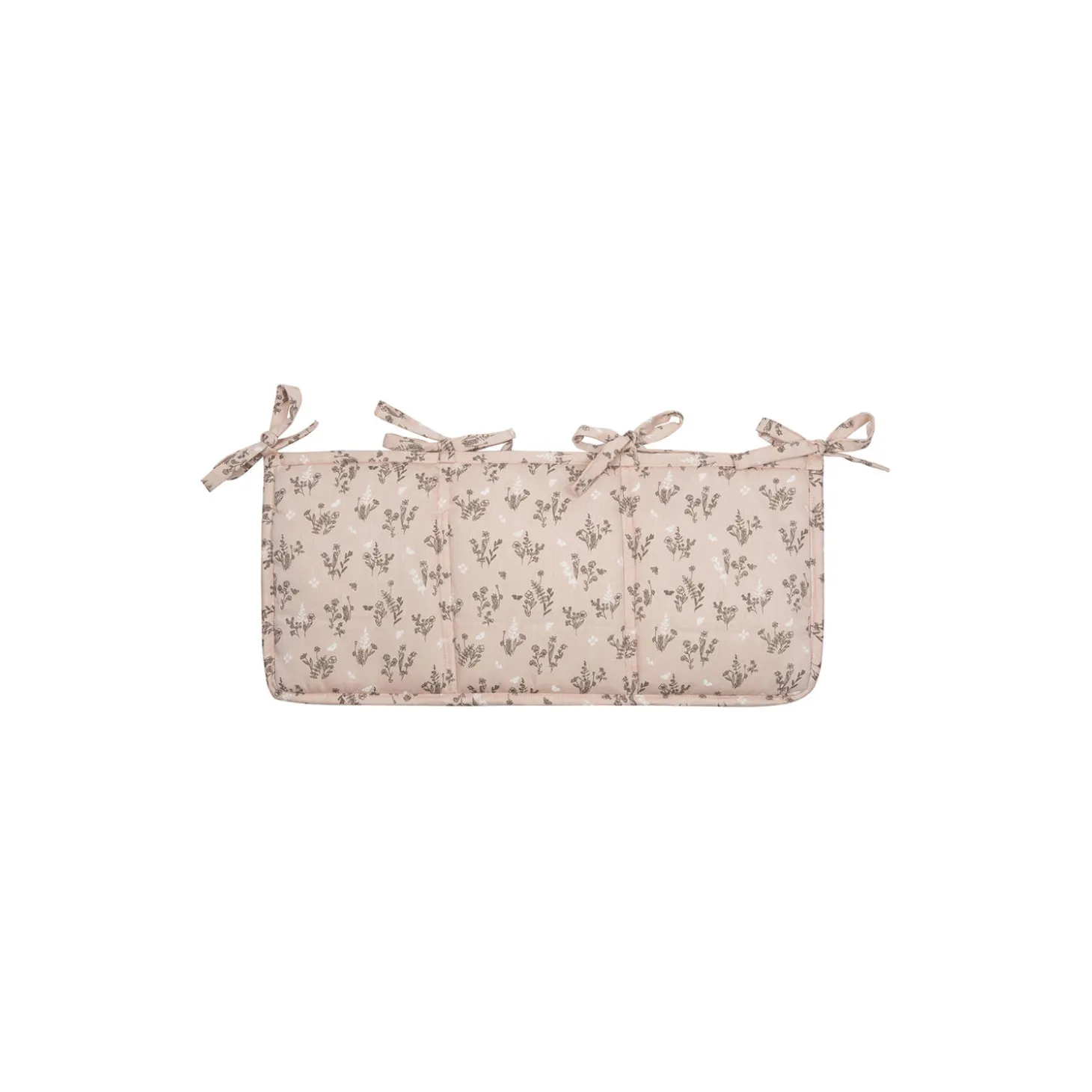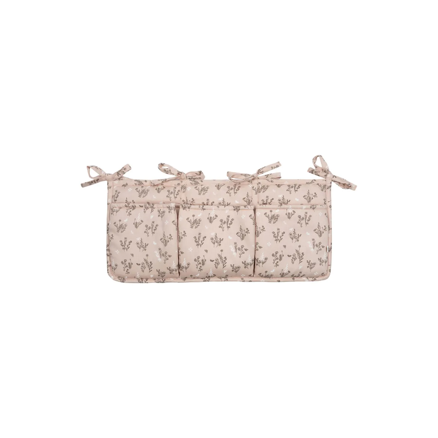 Blød og praktisk opbevaring til at hænge på sengen. Med bindebåd til fastgørelse på tremmer eller sengekant. Perfekt til pixi-bøgerne, sutter m.m. Måler 50 x 20 cm Fremstillet i 100% satin vævet bomuld med polyester fyld Produktet er Organic Content Standard (OCS) -mærket, hvilket betyder, at den %-del som står som, organic cotton, er certificeret og kan trackes tilbage til oprindelsen. Vi bruger OCS-mærket når det er nødvendigt at bruge polyester eller polyuretan som fyld i et produkt. Økologisk bomuld 62%, Polyester 38%