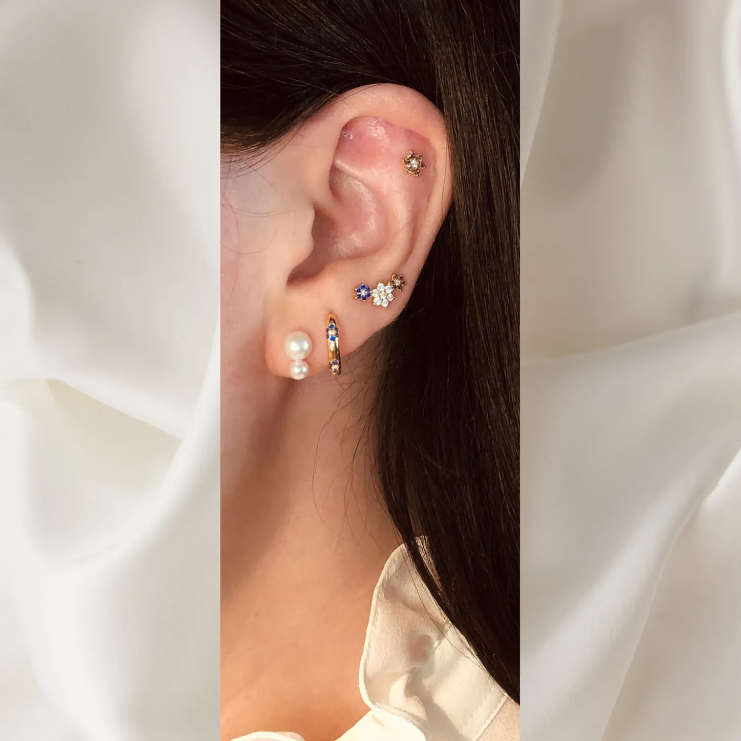 Lille ørestik med blomst med rhodolit farvede og en klar sten. Sælges enkeltvis.