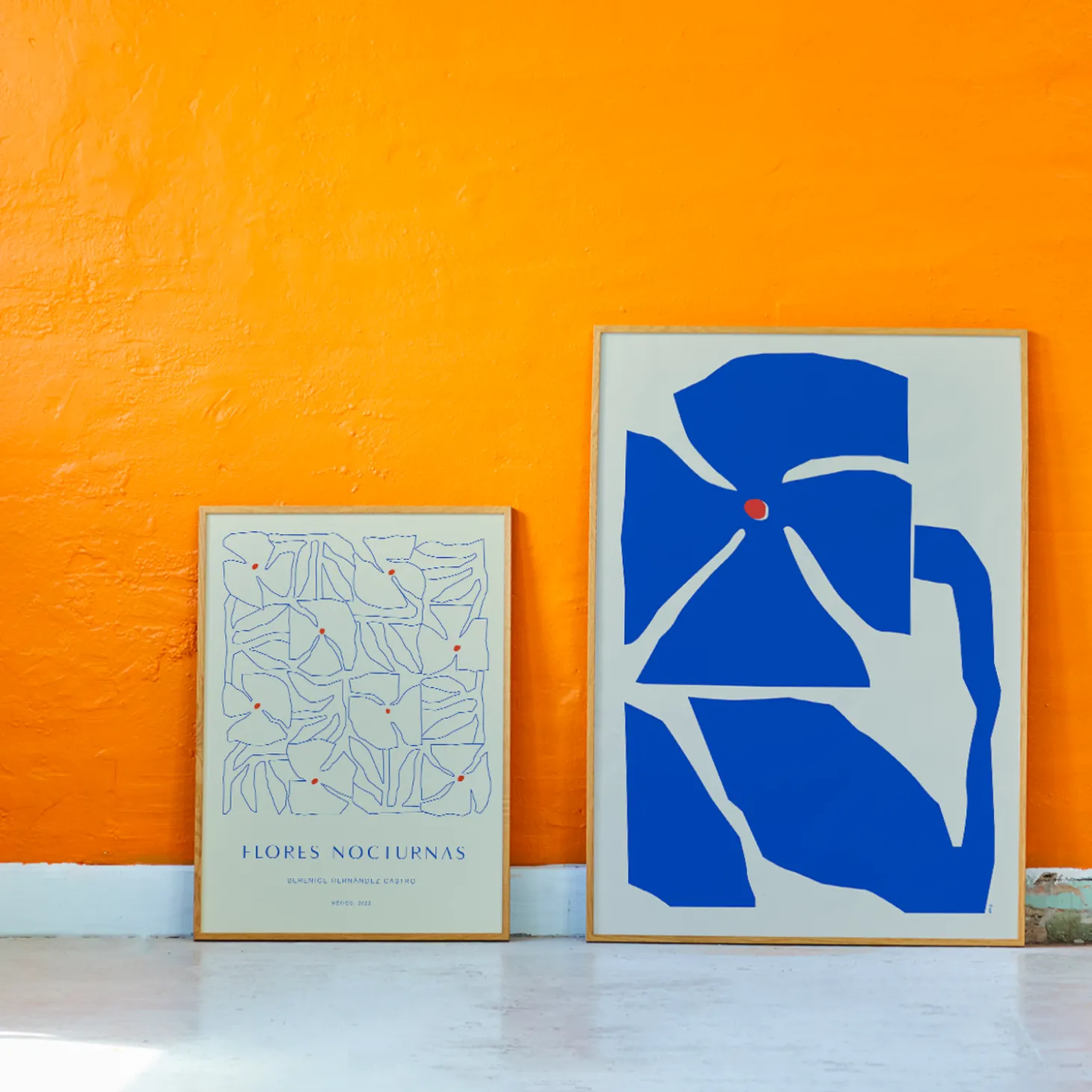 Channeling a walk in the light of a full moon, Flores Nocturnas 01 by Mexican artist Berenice Hernandez features a field of flowers basking in the moonlight. The subtle outlines of each flower in a rich indigo blue are punctuated by spots of vibrant red at the center of each. With a warm white backdrop representing the glow of the evening, this nocturnal garden in full bloom is complex yet harmonious. Berenice Hernandez for Paper Collective. An art print/poster manufactured in Denmark from environmentally certified materials and production.