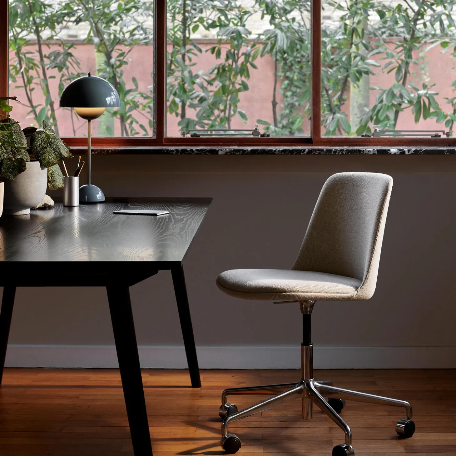 Flowerpot VP3 bordlampe i lakeret stål fra &Tradition. Farve: grey beige. Mål: H: 50 x Ø 23 cm. Lyskilde: maks. 40W E27. Design: Verner Panton.
