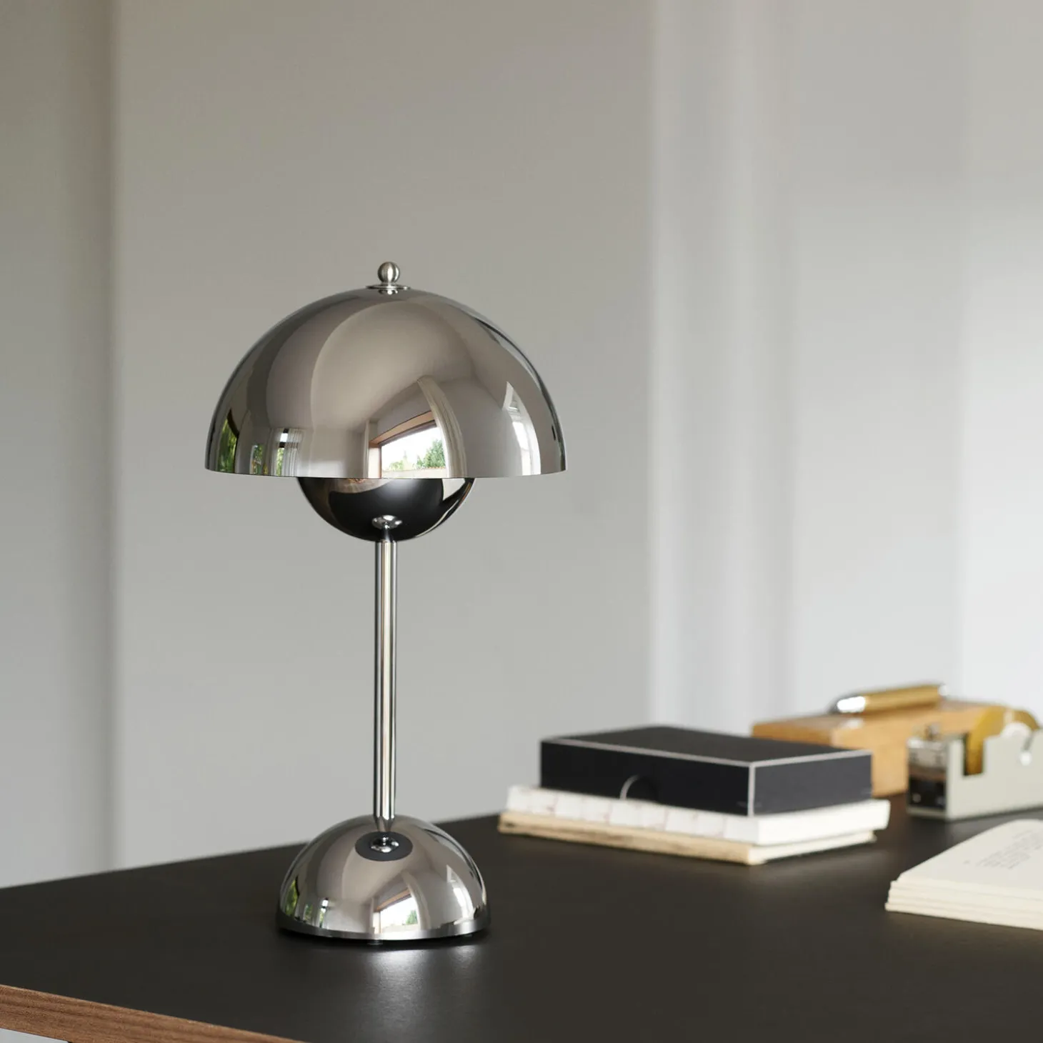 Flowerpot VP9 Portable bordlampe med dimmer i polykarbonat og stål fra &Tradition. Farve: chrome-plated. Mål: H: 29,5 x Ø 16 cm. Lyskilde: 3W LED. Design: Verner Panton.