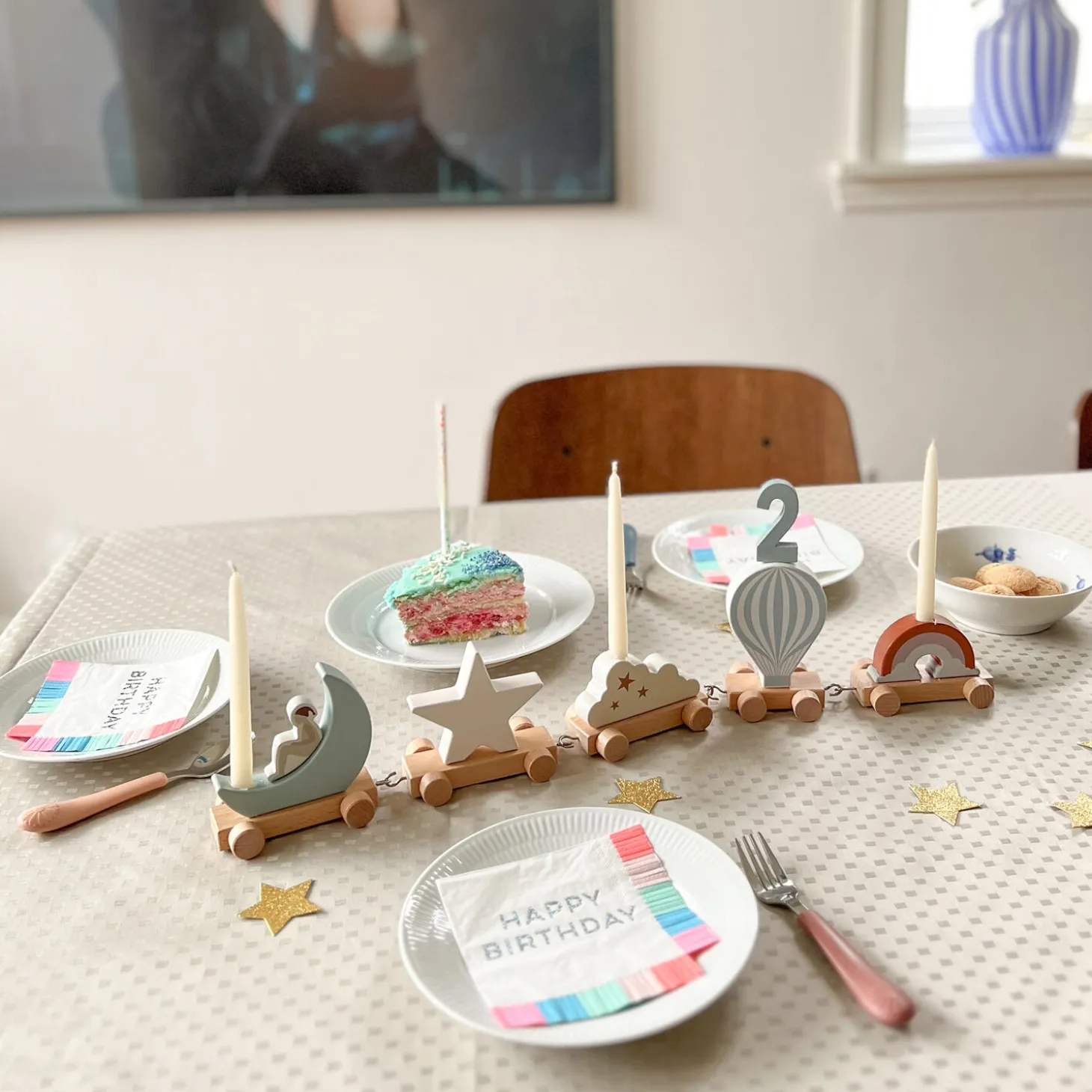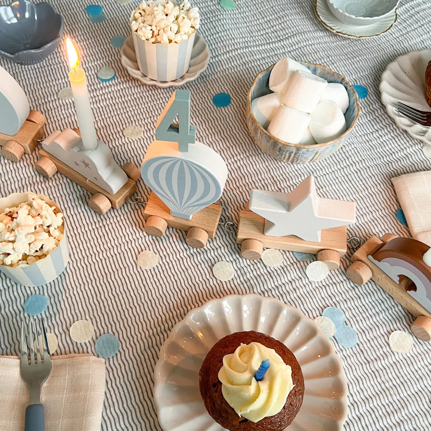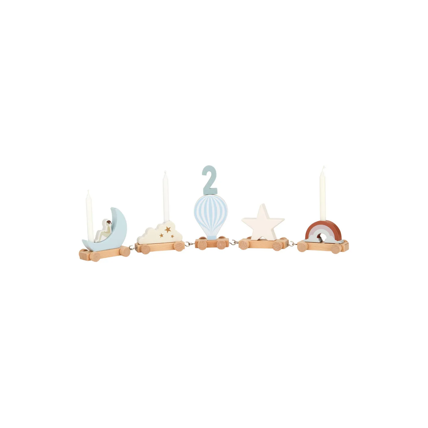 Fejr dit barns fødselsdag med dette fine FSC-certificerede Fødselsdagstog. Toget er fremstillet af naturligt og malet træ i dæmpede farver og har fem ikoniske Cam Cam-elementer fra det elskede Dreamland-print: en stjerne, en sky, en regnbue, en luftballon og en måne med et barn, der sidder på den. Delene forbindes med metalkroge, hvilket giver mange kombinationsmuligheder. Toget kommer med tal fra 1 til 6, så det kan skabe glæde om fødselsdagsbordet i mange år. Dreamland Fødselsdagstoget er et oplagt familiearvestykke, der tilføjer ekstra magi til dit barns særlige dag og er med til at skaber minder om funklende øjne og skønne familiestunder af spænding og taknemmelighed for store og små.