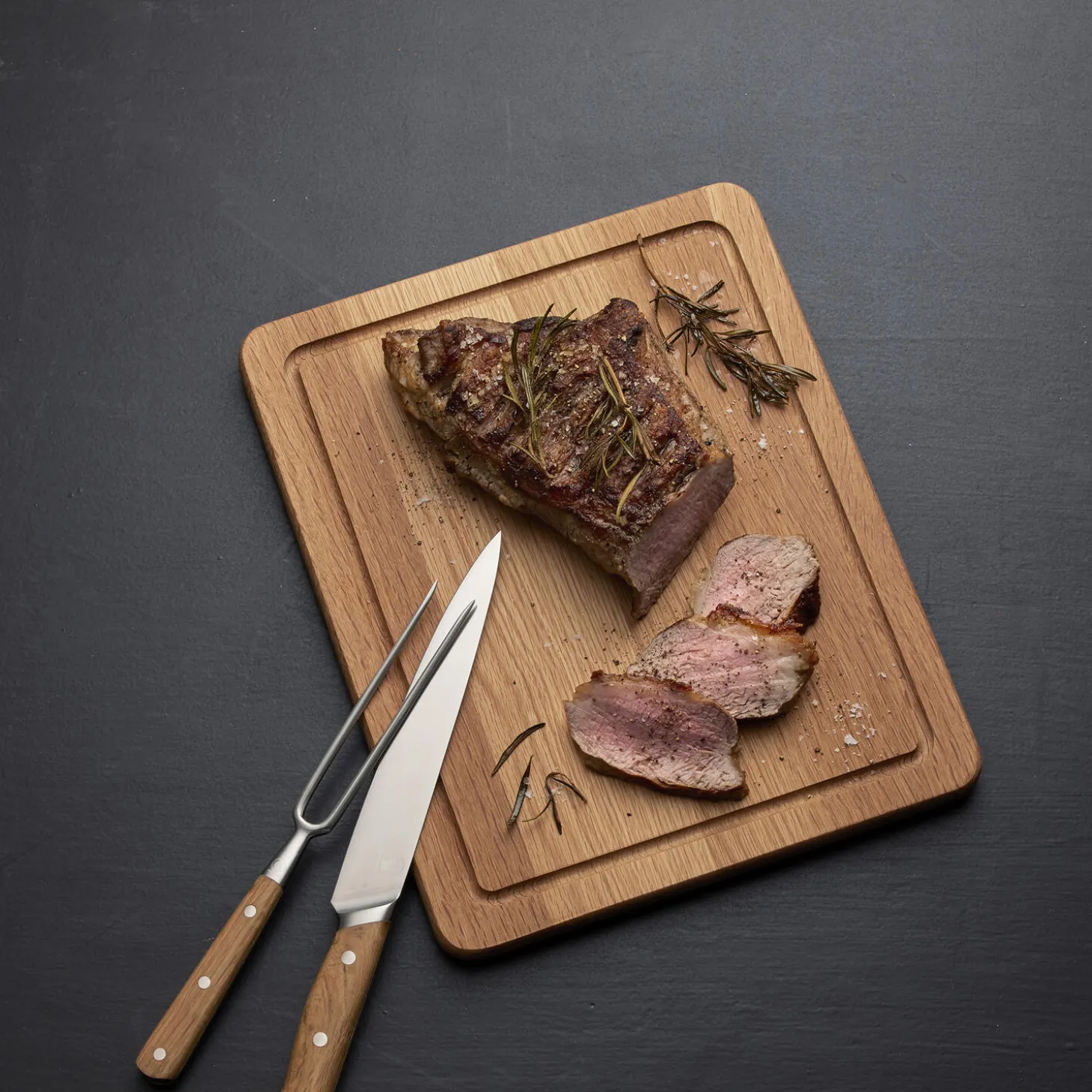 Det smukke og solide skærebræt er fremstillet af olieret eg og har mange anvendelsesmuligheder. Den ene side af skærebrættet er udstyret med en saftrille, der opsamler saft bl. a. fra kød, og den anden side er glat. Begge sider kan anvendes til udskæring og servering. Dette skærebræt er bl. a. velegnet til udskæring og servering af mindre stege samt anretning og servering af tapas. Læg aldrig dit skærebræt i blød. Vaskes med varmt vand og mild sæbe. Tåler ikke opvaskemaskine. Kan med fordel efterbehandles med madolie et par gange om året. Design: Hans Sandgren JakobsenVaren er produceret i FSC®-certificeret egetræ (FSC-C166612).