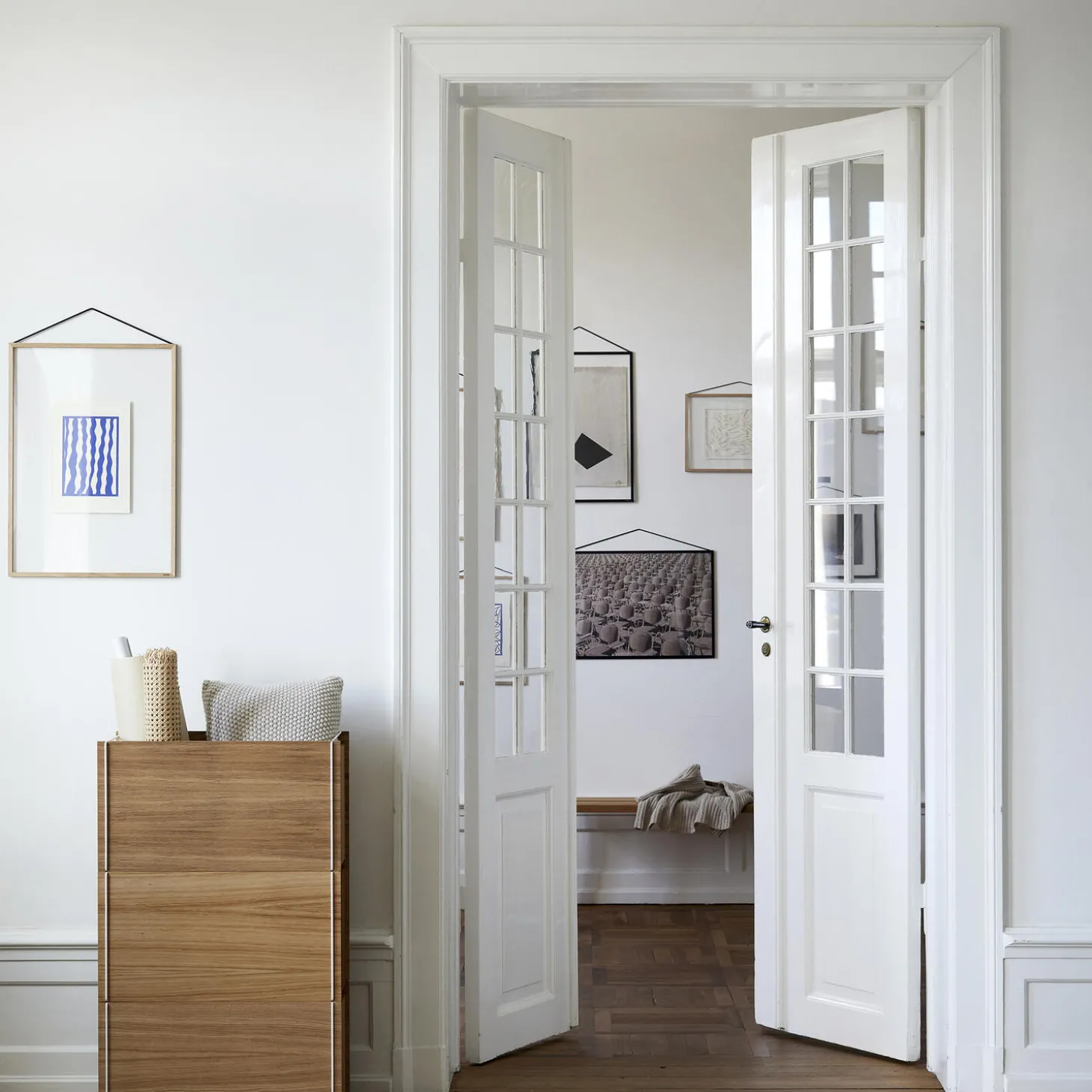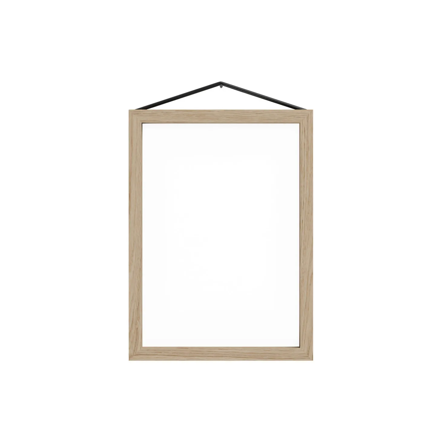 Frame consists of two pieces of acrylic glass, four lists made of either untreated oak or aluminum, and a rubber band. Available in several sizes and colours. Made in Europe.