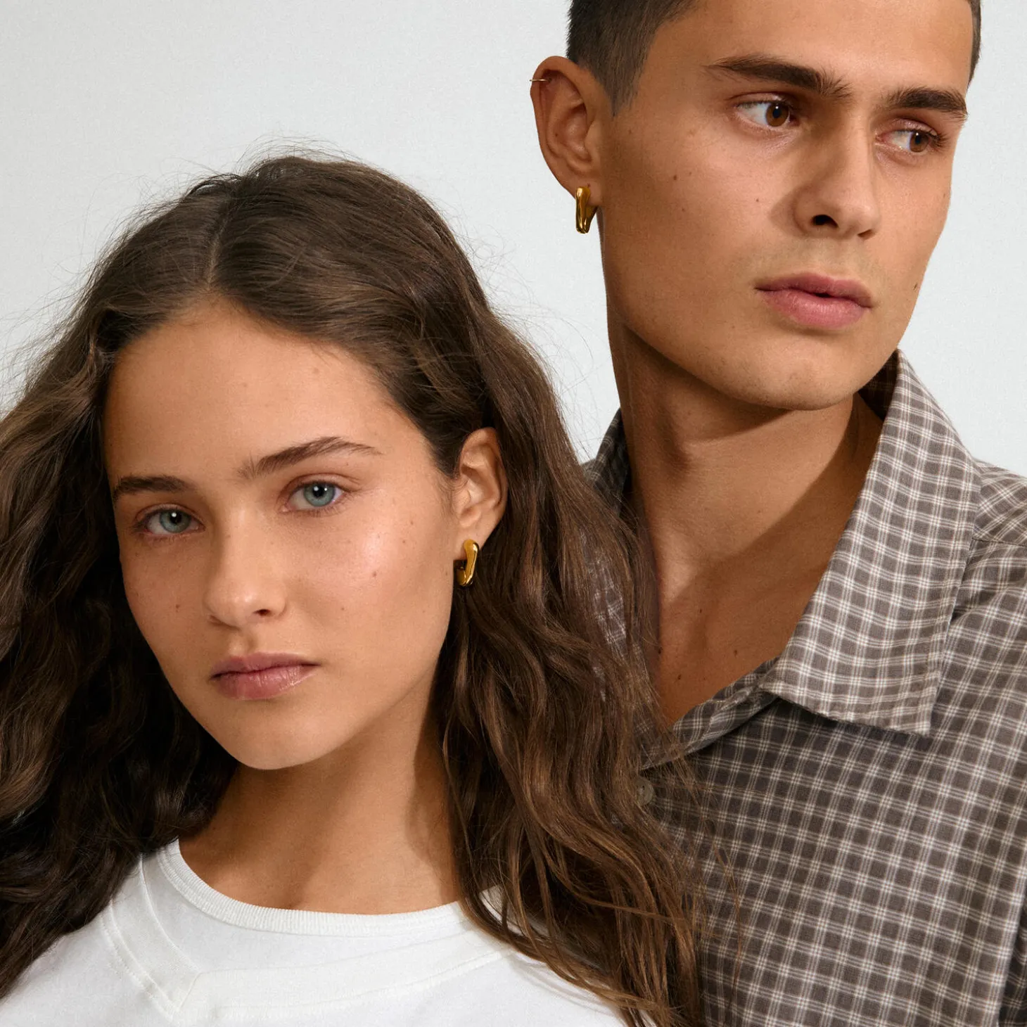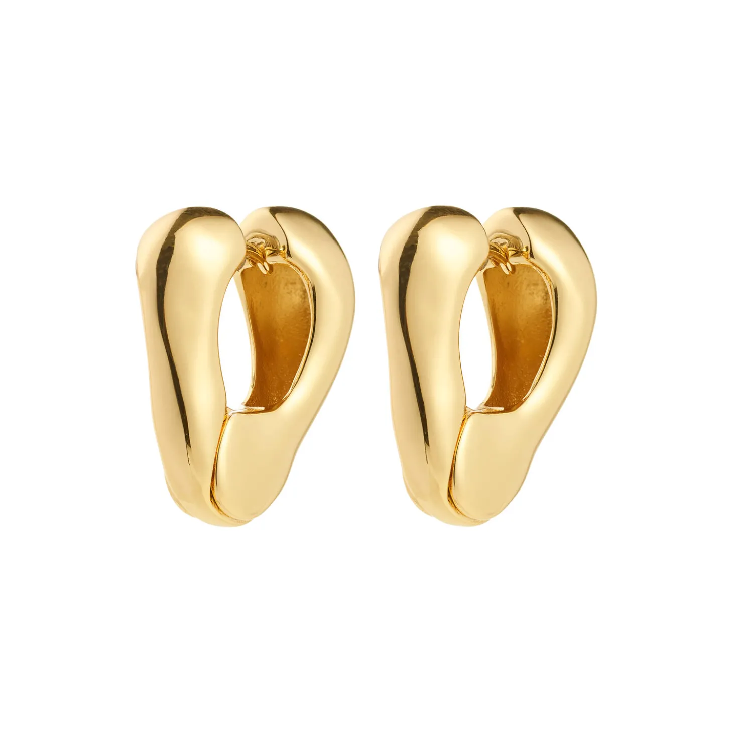 Free your mind, style your journey! De guldbelagte hoops fra Pilgrims FREE kollektion, giver dig et ikonisk accessory, der kombinerer skulpturelle former med en classy shiny finish. Inspireret af naturens rå skønhed, og sten formet af tidevandets kræfter får øreringene et naturligt, organisk udtryk, der klæder et simple clean look. Letanvendelige kliklåse gør dem til et oplagt og effortless tilvalg for din everyday outfits. Style øreringene med en oversized blazer og ankelstøvler for en impactful efterårs-vibe, og glæd dig samtidig over at de er fremstillet af 99% genanvendt materiale med omtanke for vores fælles planet.