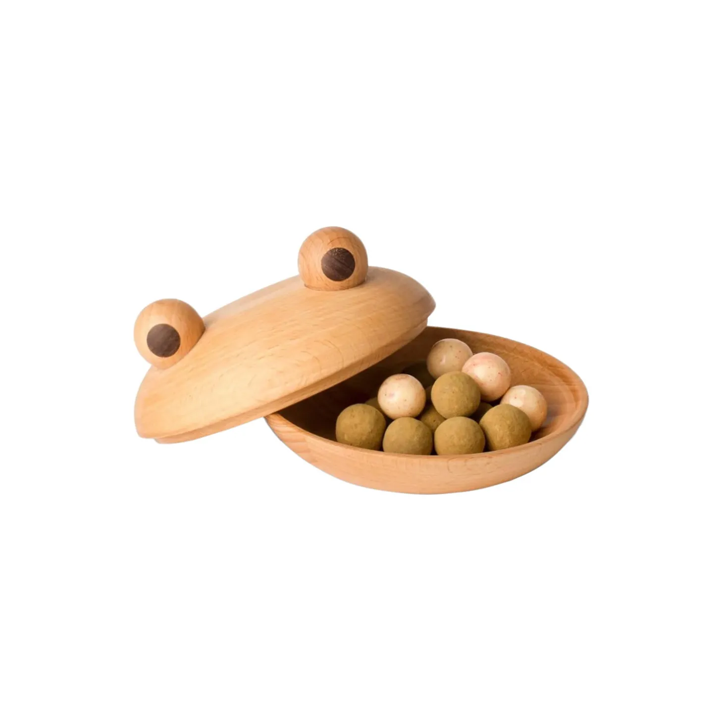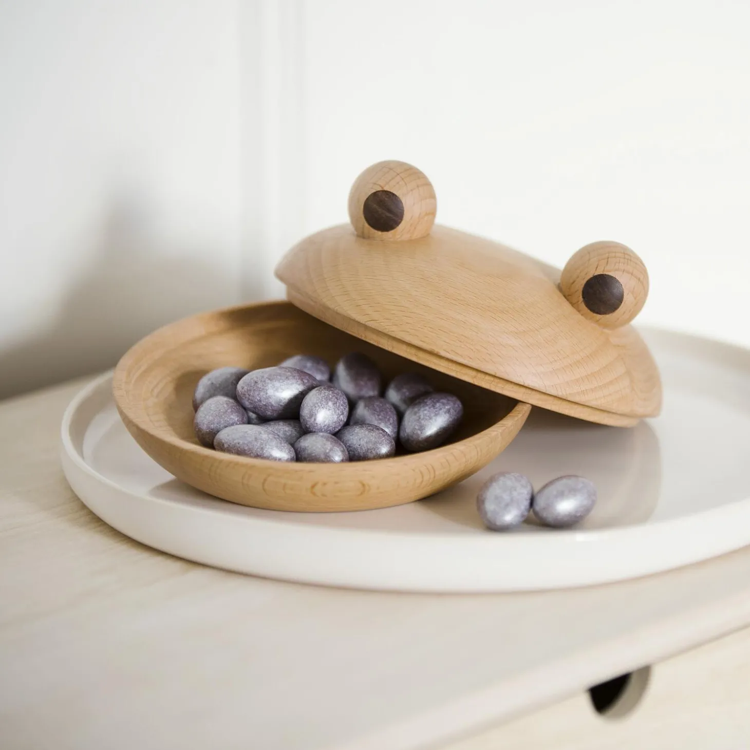 Den gladeste skål på markedet! Frøskålen er en legende og dekorativ skål i bøgetræ og valnød, hvis hoved kan drejes, så den ændrer humør, alt efter hvordan top og bund vinkles i forhold til hinanden.