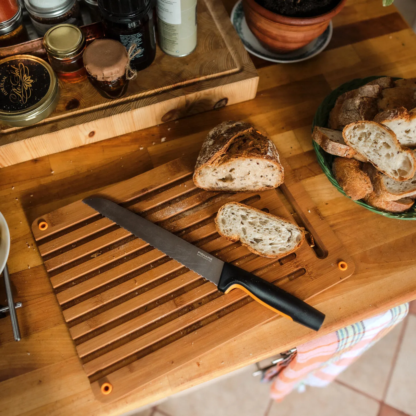 Fiskars Functional Form™ Bambusskærebræt til brød er dobbeltsidet med en rillet side til udskæring af brød og en flad side til tilberedning af grøntsager, frugt, krydderurter og meget mere. Når du skærer brød, falder krummerne igennem rillerne på skærebrættet og opsamles, så det altid er nemt at rydde op. Skærebrættet står stabilt takket være skridsikre silikonefødder. Skærebrættet er fremstillet af bæredygtigt FSC®-certificeret bambus (FSC® C108780) og behandlet med linolie for længere levetid. Det anbefales at vaske bambusbrættet i hånden. Designet i Finland.