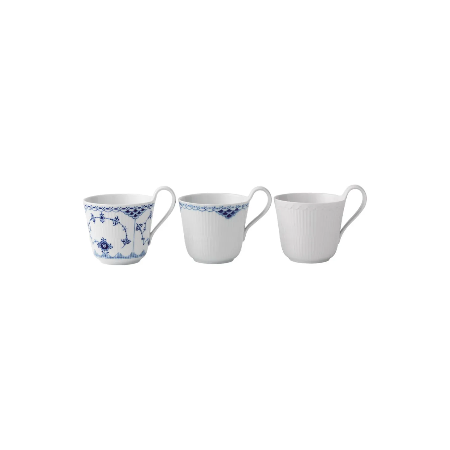 Gifts With History blonde krus i porcelæn fra Royal Copenhagen. Tre halvblonde stel mødes i smuk forening i dette gavesæt med krus på 33 cl i stellene Musselmalet Halvblonde, Prinsesse og Hvid Halvblonde. Den romantiske halvblonde skaber en smuk sammenhæng, om end hver kop har sit eget tydelige udtryk af håndlavede detaljer. Gavesættet er også en yndefuld tilføjelse til en personlig, eller starten på en ny samling af Royal Copenhagen.