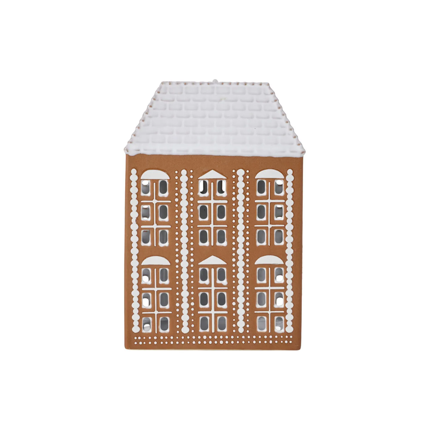 Kähler Gingerbread er en serie af håndlavede honningkagehuse, hvor Kählers keramiske ophav og den danske jul er sat på en fælles designformel. Dette honningkagehus emmer af jul, charme og traditioner og er med sine 17 cm i højden det største af honningkagehusene. Husets forside er belagt med et fint bindingsværkmønster, et cirkelformet og smukt dekoreret vindue og en stor port, der inviterer indenfor til masser af autentisk varme og hygge. Siderne på lyshuset er pyntet med store, hvide hjerter som symbol på den kærlighed, der ligger i hjerternes fest – julen. Skab et hyggeligt julelandskab med nisser omkring husene eller brug dem alene som håndlavede designelementer, der med deres blanke og taktile glasur og den rå, uglaserede keramik vil stå smukt og sprede hygge. Gingerbread-lyshusene har en brun, mat yderside, der minder om honningkagedejen og er pyntet med hvide, blanke dekorationer og hvide tage, der ligner glasur. Og som en vigtig detalje er honningkagehusene hvidglaseret indvendigt, så det varme lys fra fyrfadslyset reflekteres og skinner ud. Store som små er de alle udskåret i hånden, og lyset fra husene skaber på denne måde legende klynger af lys og skygge omkring sig, hvor end honningkagehusene placeres.