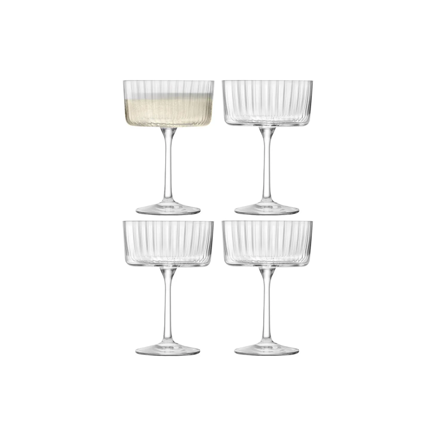 Et sæt af 4 stk. cocktail- eller champagneglas med rene linjer, bløde firkantede kanter og parrede bagsidesilhuetter. Den lineære, teksturerede finish fremhæver Gios rene, moderne design. Ideel til servering af cocktails, champagne eller prosecco.