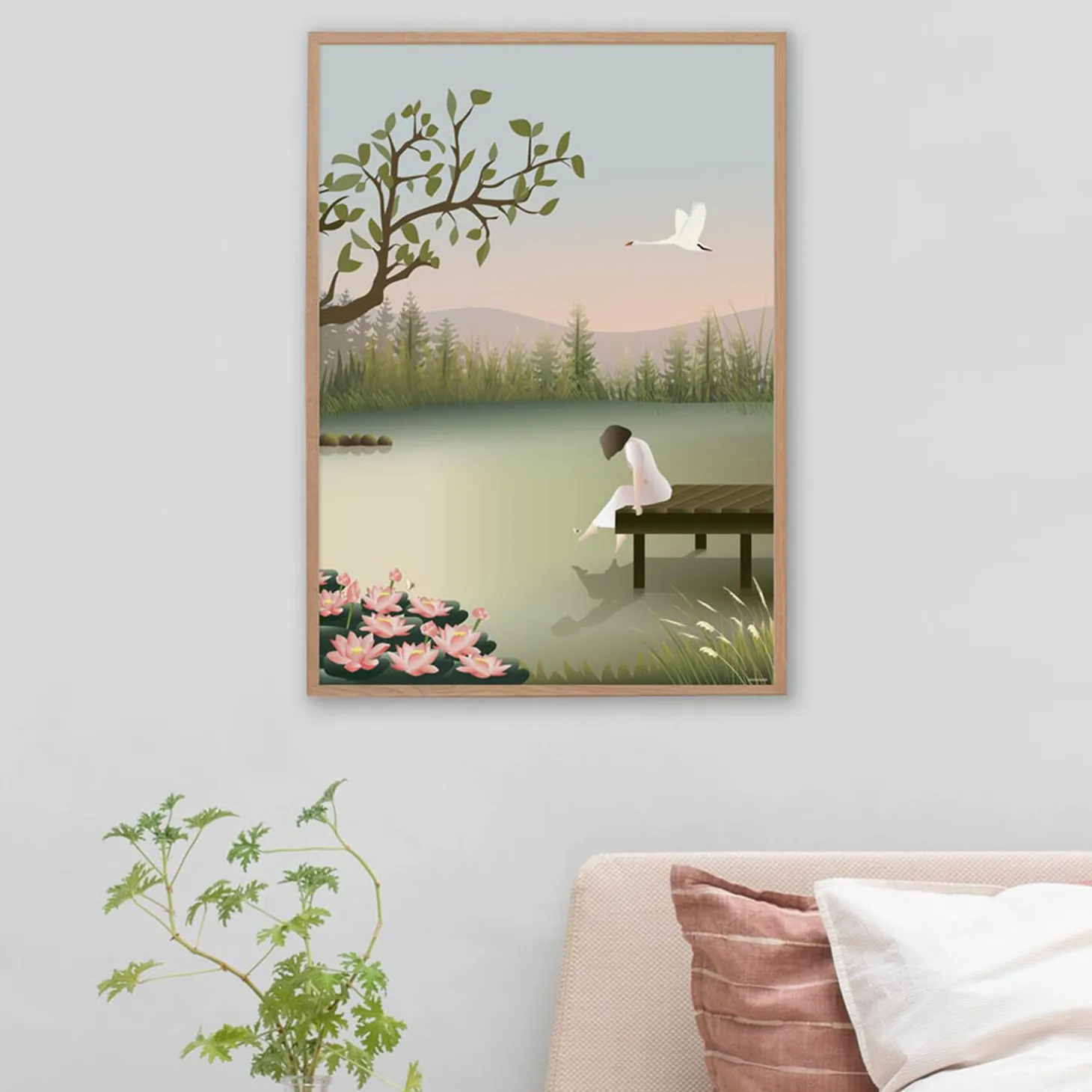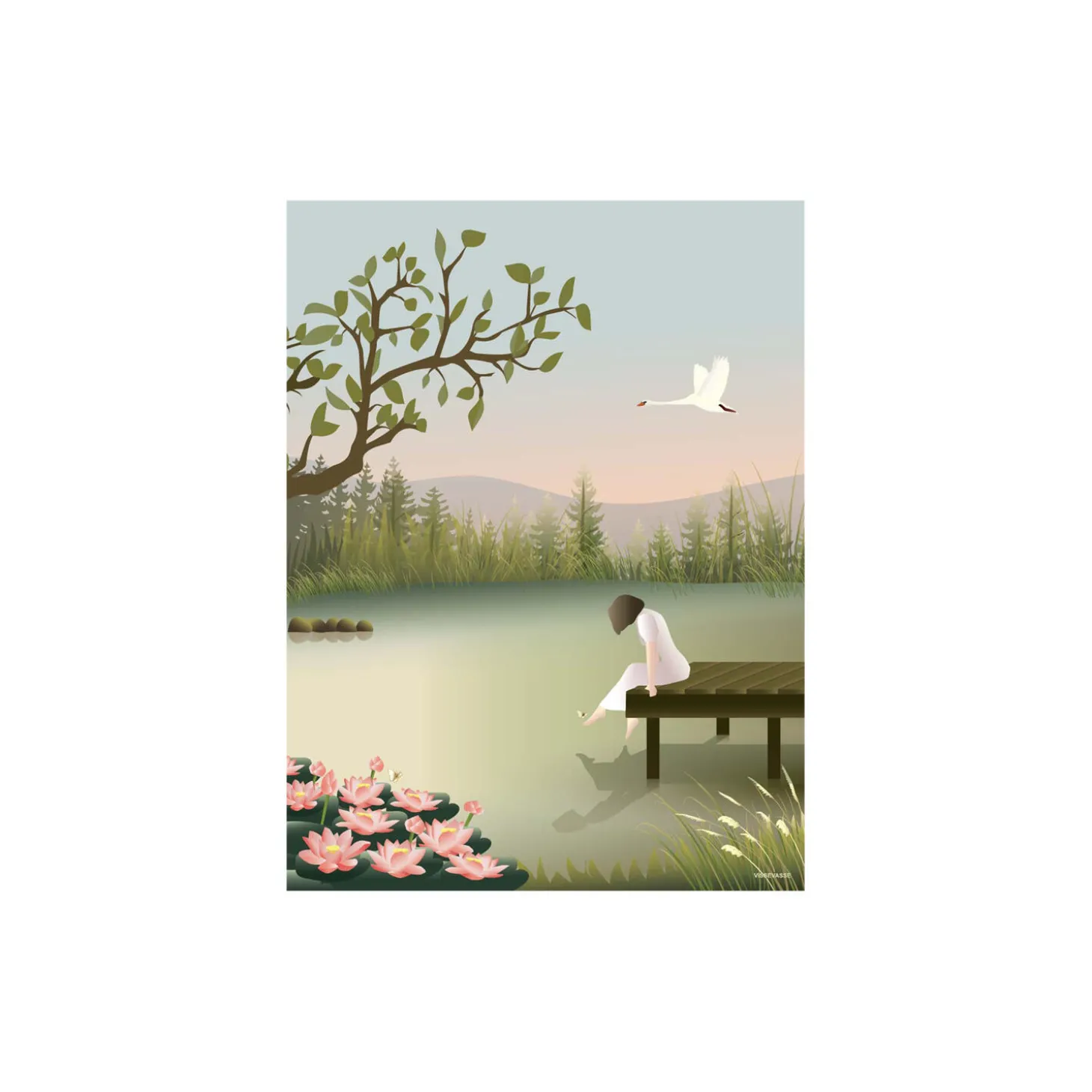 Alt er stille her, men du kan mærke naturens tilstedeværelse. Blomsterne, der spirer, fiskene i vandet, solens stråler. I dette øjeblik er du i symbiose med naturen og du føler dig hel. Dit spejlbillede i vandet fortæller dig, at du smiler fra øre til øre. Plakaterne er FSC certificeret og trykt på 170 gr. Arctic Silk papir produceret i Sverige. Produktet er produceret i Danmark.