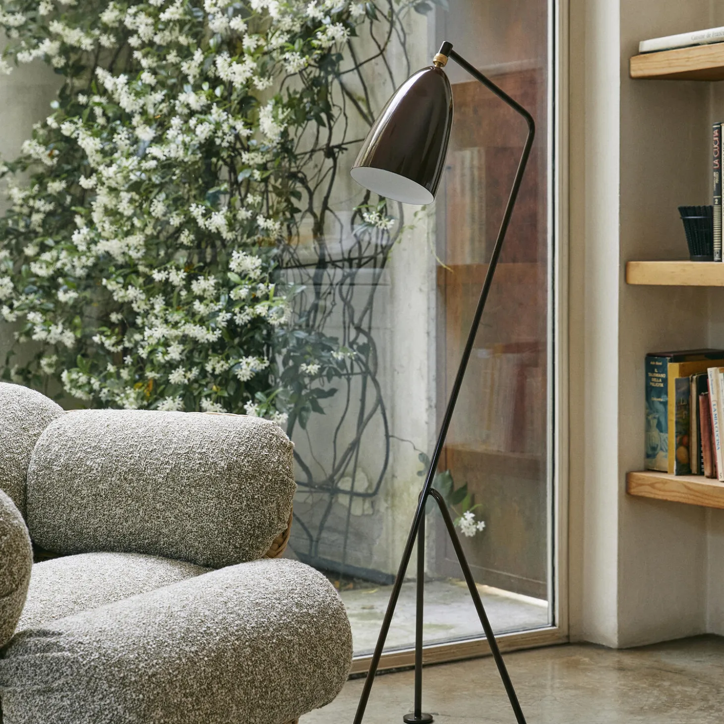 Gräshoppa Floor Lamp i pulverlakeret stål og messing fra GUBI. Farve: walnut brown glossy. Mål: H: 125 x Ø 37,5 cm. Lyskilde: 4-6W LED E14. Design: Greta M. Grossman.