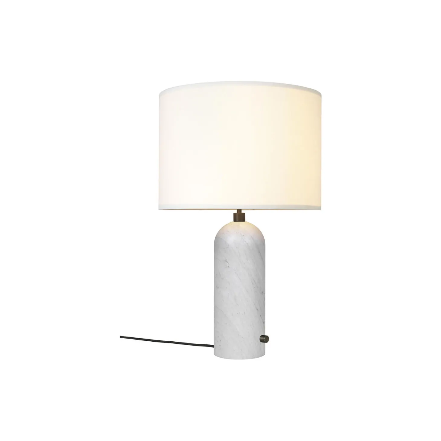 Gravity Table Lamp med base i marmor og skærm i tekstil fra GUBI. Farve: white marble/white. Mål: H: 65 x Ø 41 cm. Lyskilde: 5-6W LED E27. Design: Space Copenhagen.