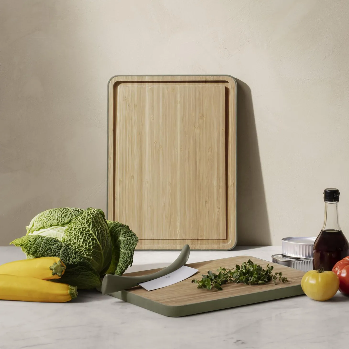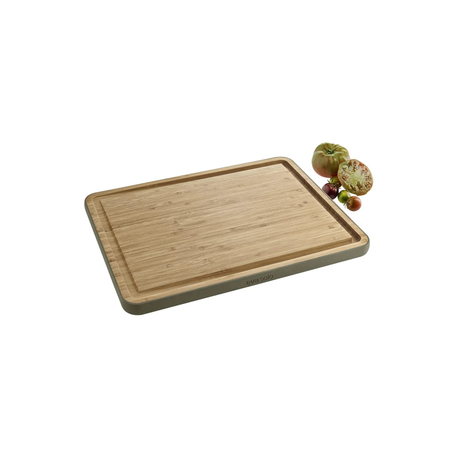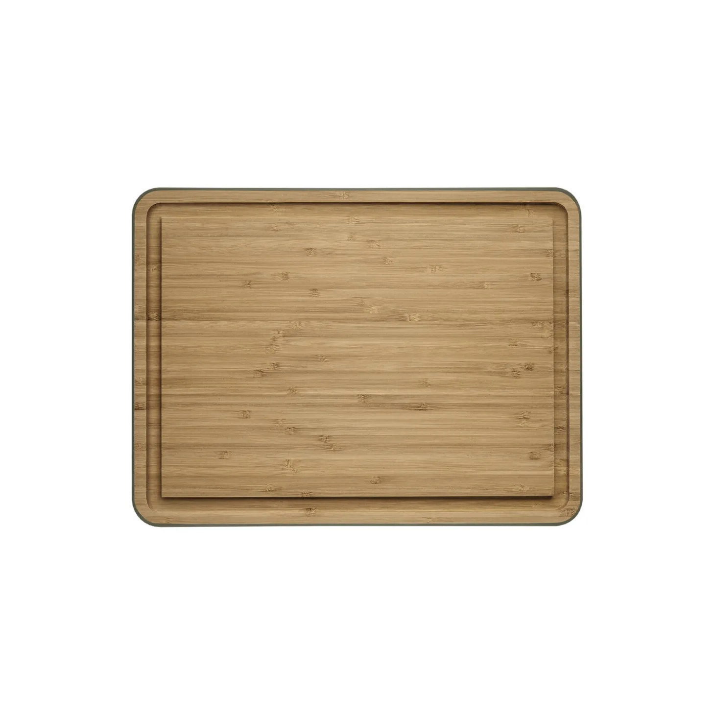 Skridsikkert skærebræt med praktisk saftrille i 100% FSC-certificeret bambus, som er hårdfør og tåler hverdagens brug. Skærebrættet er forsynet med en silikonekant og små silikonefødder, der sikrer, at brættet bliver, hvor det skal og dermed letter arbejdet. Saftrillen i kanten opsamler væsken fra saftige grøntsager eller kød, så det ikke løber ud på bordet. Brug også brættet til servering. Rengøres i hånden med varmt vand og sæbe. Vedligeholdes ved regelmæssig oliering. Fremstillet i 100% FSC-certificeret olieret bambus og silikone.