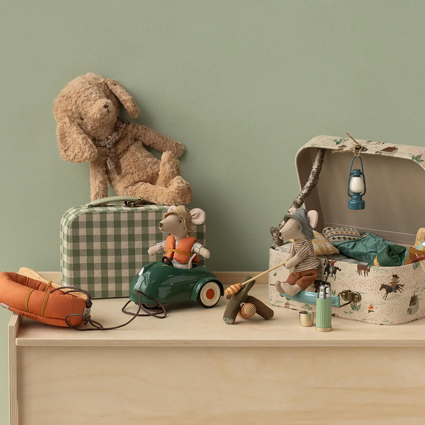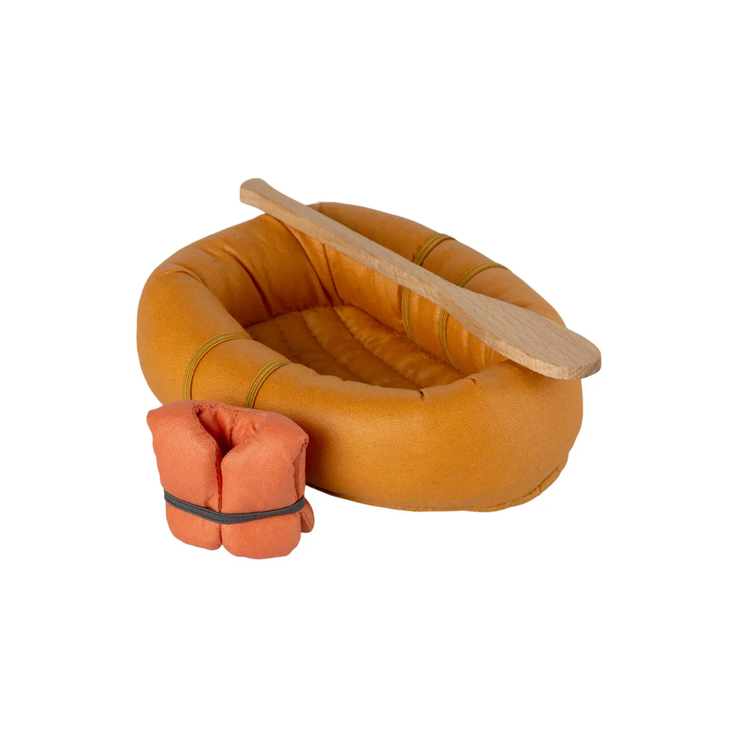 Denne lille gummibåd er lavet af stof og kommer med redningsvest og pagaj. Den er ikke vandtæt, så du skal forestille dig, at den flyder på vandet. Kombiner den med vandremusene og andre udendørs tilbehør for at udvide historien.