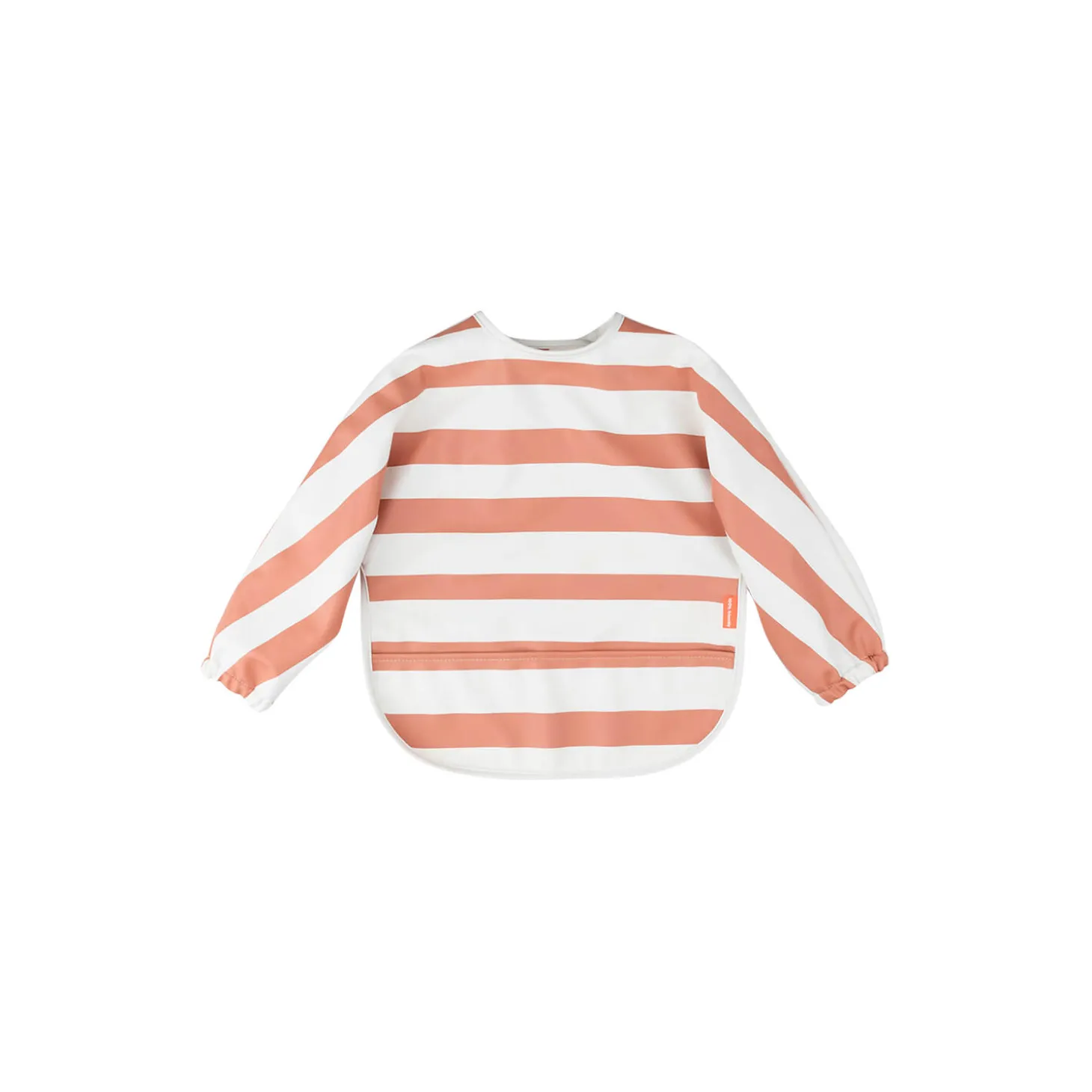 Det kan godt blive rodet, når man skal lære at spise selv. Hagesmækken med lange ærmer og lomme vil beskytte dit barns tøj ved spisetid eller ved kreative lege. En justérbar dobbeltlukning sikrer, at hagesmækken passer til både babyer og tumlinger. Den bløde hagesmæk er vandtæt og har praktiske ærmer med elastik, der holder de små tørre. Den er nem at tørre af og holde ren, hvilket sparer dig for en masse vasketøj. Den søde hagesmæk har striber i en flot papayafarve.