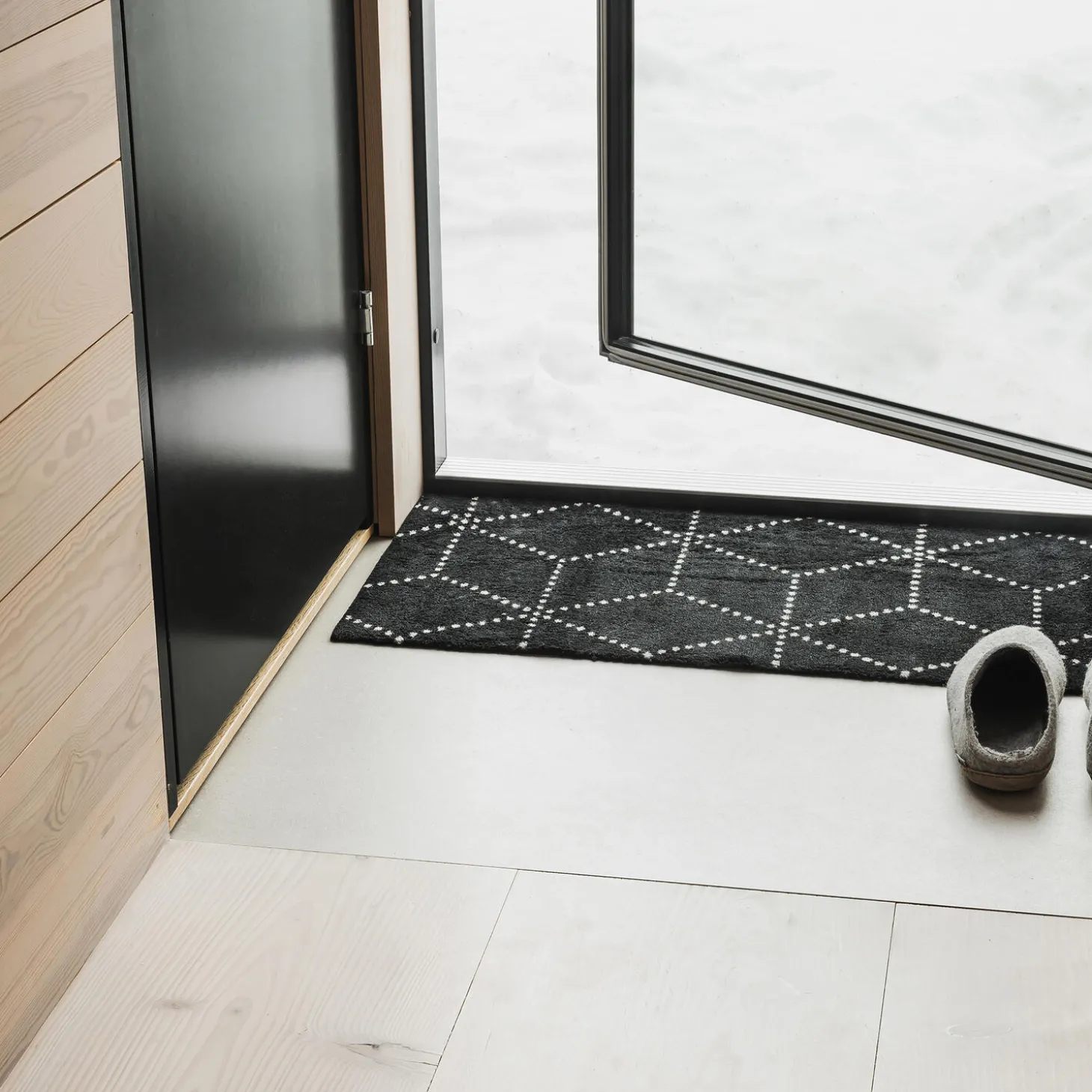 High-quality mats for the terrace door. The mat has a soft upper surface and rubber backing. Our mats are made to handle feet that have braved all kinds of weather – including cold, wet winters, which is what Hagl Black is inspired by. Small pellets of hail create an eye-catching, geometric pattern against the dark evening sky, adding a discreet and playful touch to your home. The mat is part of the Hagl collection, which also consists of Hagl Silver. *Be aware that width and length can vary 1-2 cm