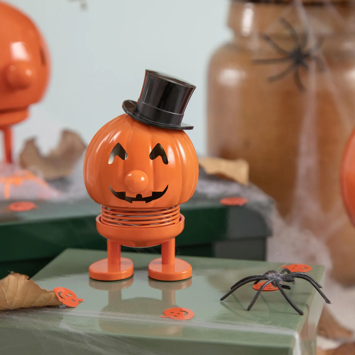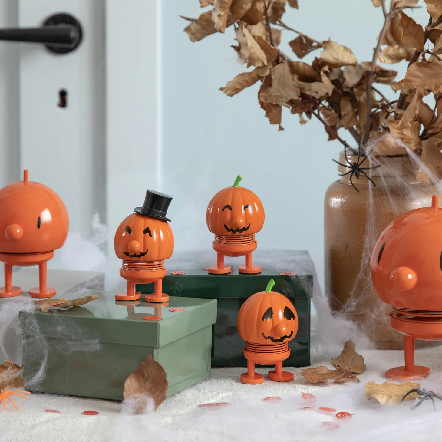Når mørket falder på, og månen kaster sit lys gennem efterårsnatten, begynder den lille Halloween-Hoptimist sin dans på hylden. Med et lumsk smil og små, spjættende hop spreder den glæde og sjov blandt græskarlygter og spindelvæv. H 7,8 cm, D 6,1 cm