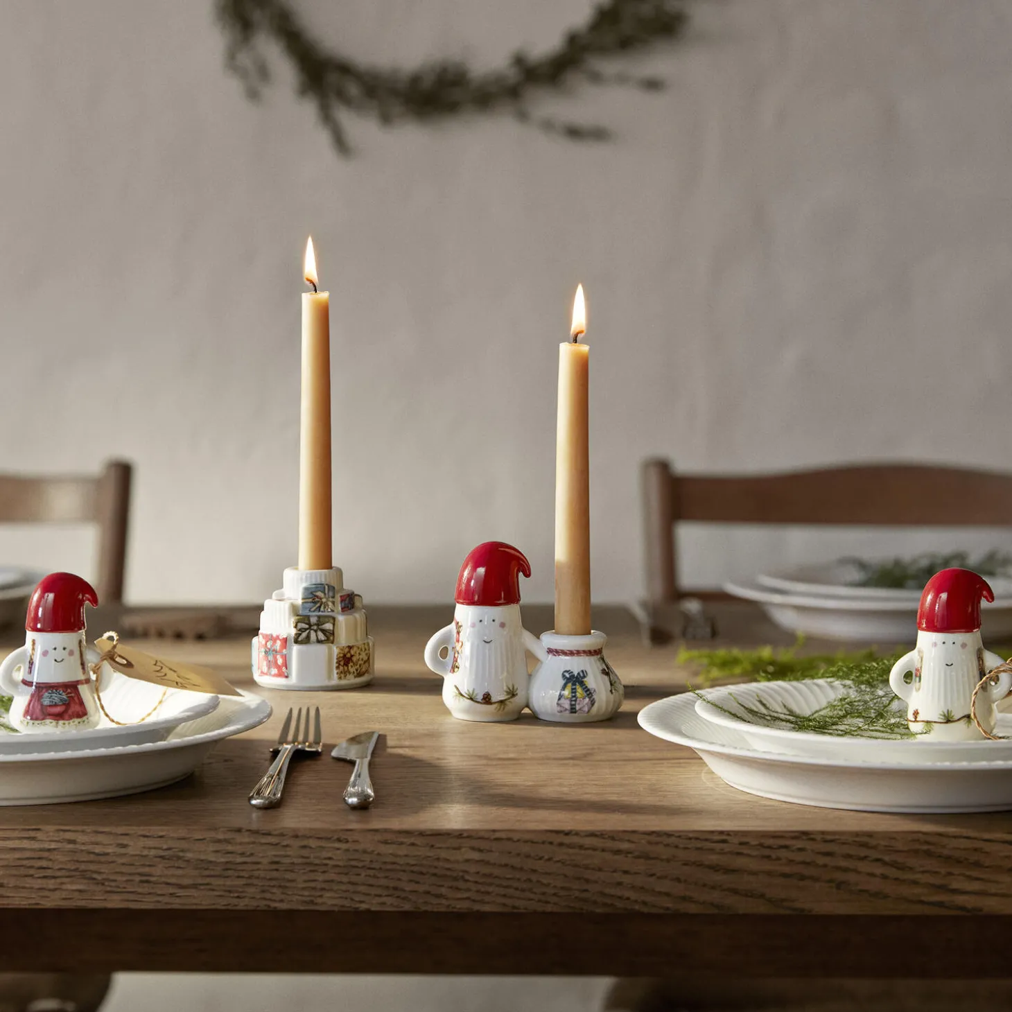 Juletraditioner og håndværkstraditioner i skøn forening. Med den lille nissefamilie med gaver fra Kählers juleserie Hammershøi Christmas bringer du julestemningen ind i boligen med glade smil og søde julemotiver i et skulpturelt og markant design, du kan mærke – autenticitet og kreativt håndværk formet af tradition. Hammershøi Christmas-nissefar er udformet i bløde linjer med Hammershøi-seriens ikoniske riller, der kendetegner Hans-Christian Bauers stel og bordpynt. Nissemor-figuren måler 9 cm i højden og er foruden den ikoniske cedergren med lærkekogler dekoreret med et fint rødt forklæde med en hvid kant med grønne hjerter. Ud over sin store kærlighed til julesmåkager elsker hun at strikke, så hun har naturligvis både garnnøgle og strikketøj liggende klar i forlommen. Ingen nisse uden nissehue. Og derfor har nissemor selvfølgelig også den sødeste håndmalede nissehue i ægte nisserød, der for ægte Hammershøi Christmas-fans nok vil virke ret bekendt med sit karakteristiske buk ud til siden. Den er nemlig ligesom alle de andre motiver i serien skabt og malet i akvarel af kunstner Rikke Jakobsen i den velkendte hyggelige og håndmalede stil og herefter overført til det snehvide porcelæn med en særlig teknik. Hammershøi Christmas-nisserne er sammen med figuren med gavestakken autentisk dansk design, der kan gøre spisebordet mere levende, fortælle nye historier i vindueskarmen og fremhæve dit hjems skønhed fra en simpel hylde i reolen. For ligesom julen er også Kähler formet af tradition. Med Kählers juleserie Hammershøi Christmas kan du dække op til alle decembers sammenkomster fra brunch og frokost til julemiddag og æbleskivehygge, og det er oplagt at invitere de søde nisser med til bords, hvor de vil skabe stemning og hygge. Og har du lagt mærke til en helt særlig både finurlig og funktionel designdetalje? Nissefiguren står stolt med armene i siden, så der dannes et lille hul omkring albuerne – perfekt til at binde et flot bånd på og måske ovenikøbet vedhæfte dekorative bordkort til dine julegæster. Eller hvis du tør! Binde hende sammen med nissefar så de kan stå som det sødeste lille nissepar. Enkelt, elegant og kreativt. Skabt af kreative og omhyggelige hænder. Fordi Kähler gør indtryk med sit tydelige aftryk.