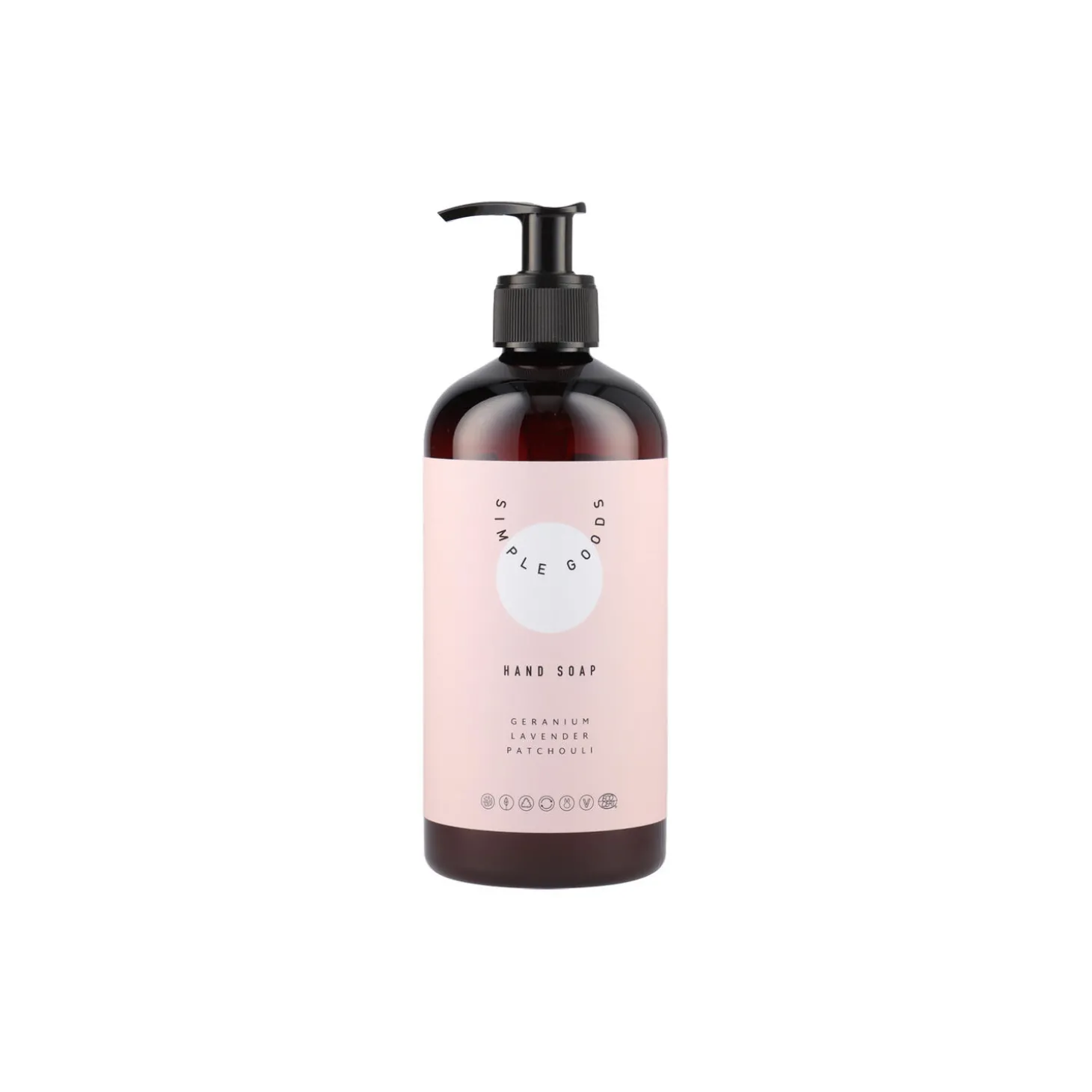 Hand Soap fra Simple Good. Duft: geranium, lavendel, patchouli. Simple Goods håndsæbe er fremstillet af naturlige og økologiske ingredienser og tilsat naturens gode bakterier – Probiotica. Sæben efterlader dine hænder bløde, rene og velduftende. Simple Goodsudvælger med omhu vores 100% økologiske æteriske olier i forhold til deres unikke duft og positive virkning på krop og sjæl. Nyd den afslappende effekt af lavendel og geranium kombineret med den styrkende og opløftende effekt af patchouli.