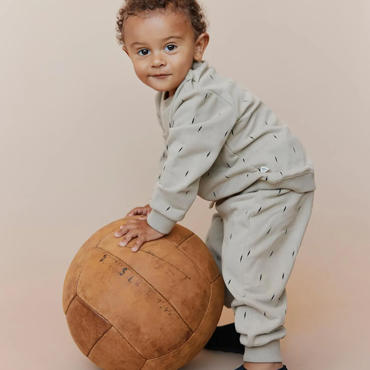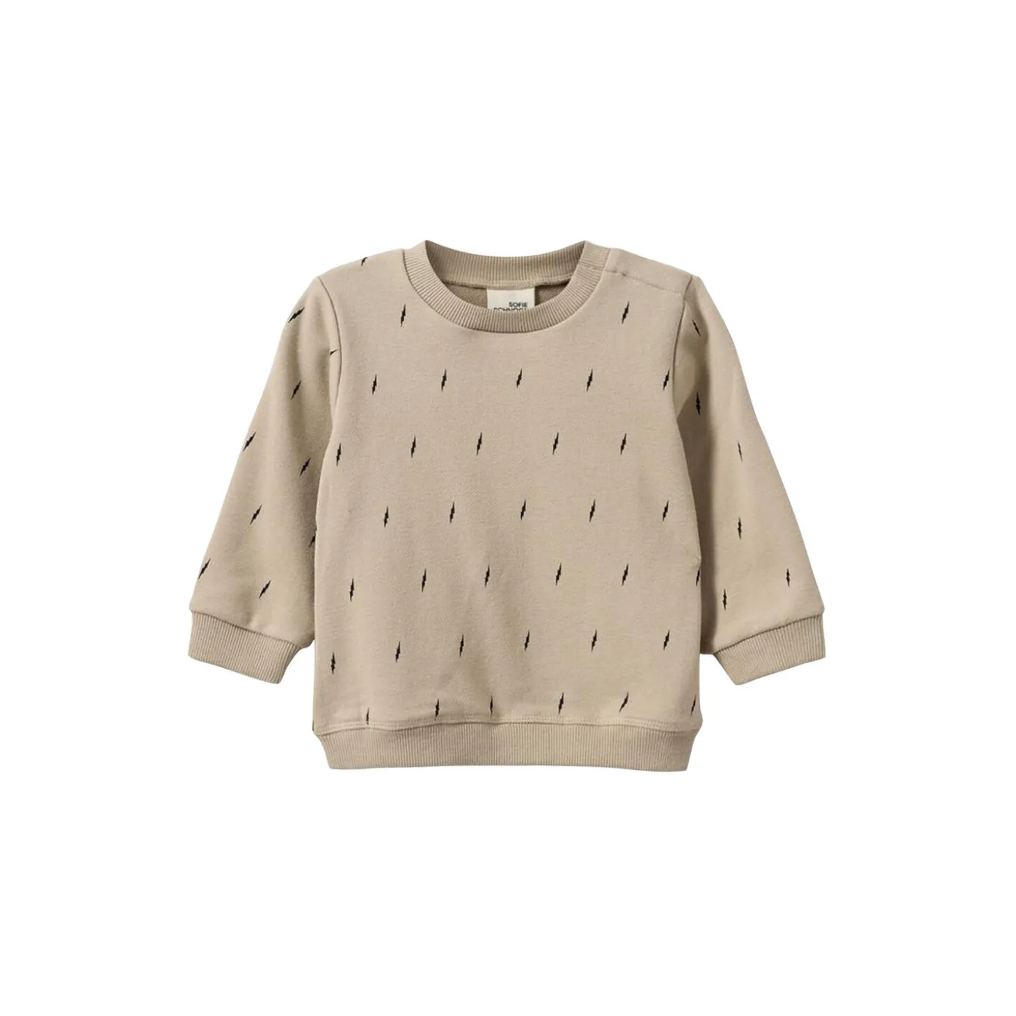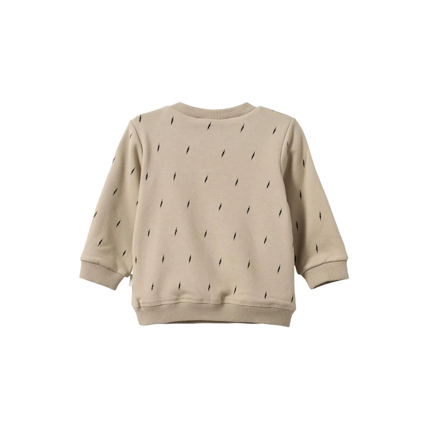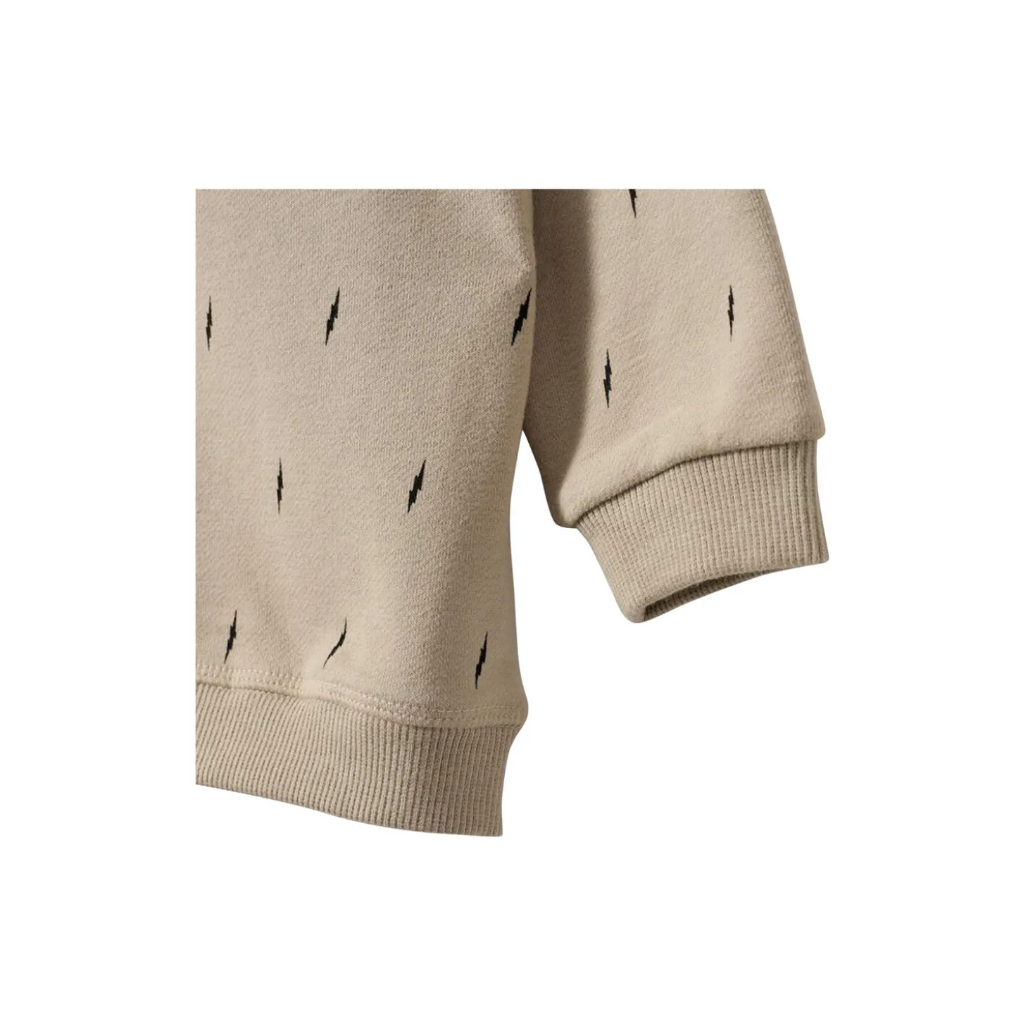 Sweatshirt i beige med små, sorte lyn-print. Trøjen har lange ærmer og elastik ved talje og manchetter. Fremstillet i en blød blanding af 87% Bomuld 10% Polyester 3% Spandex.