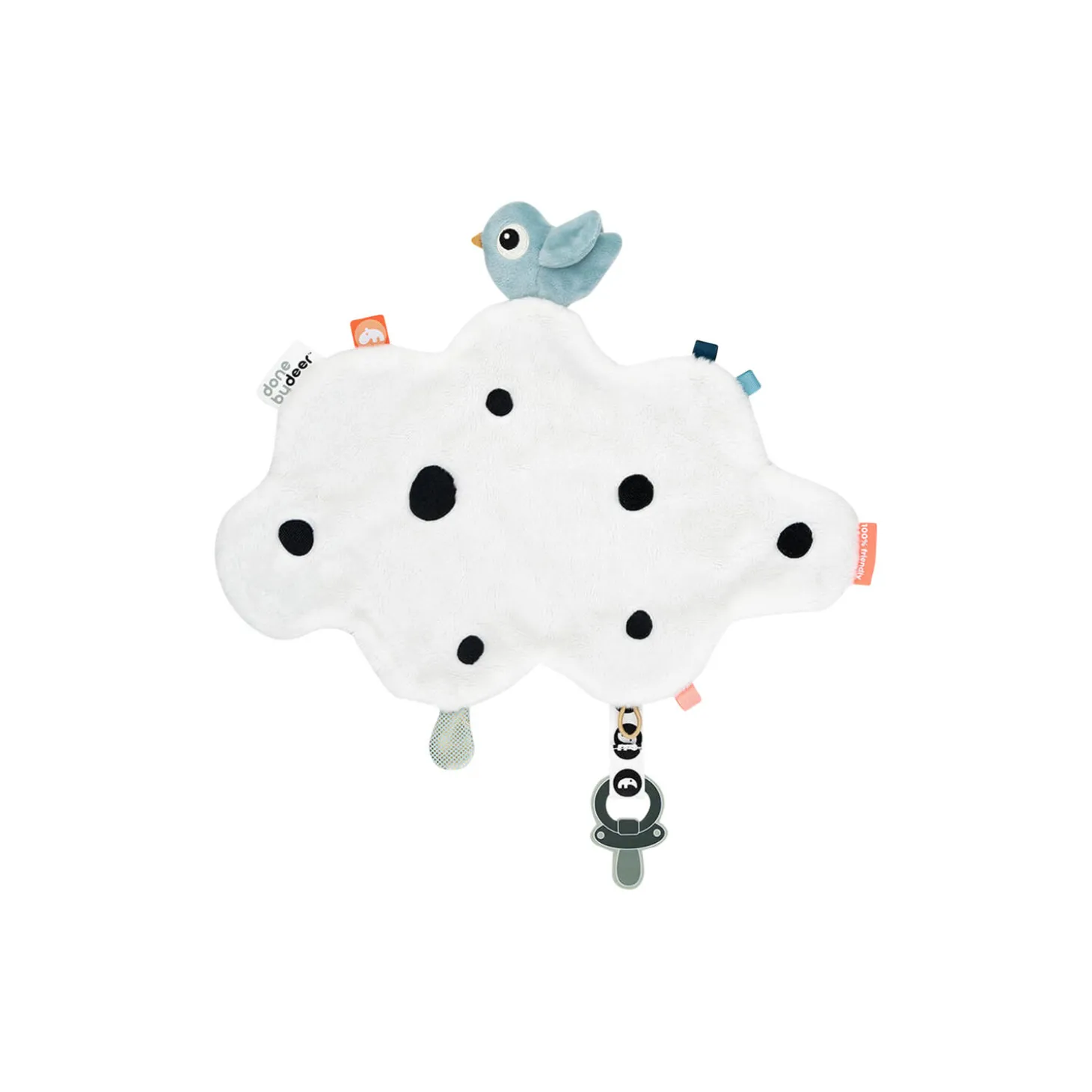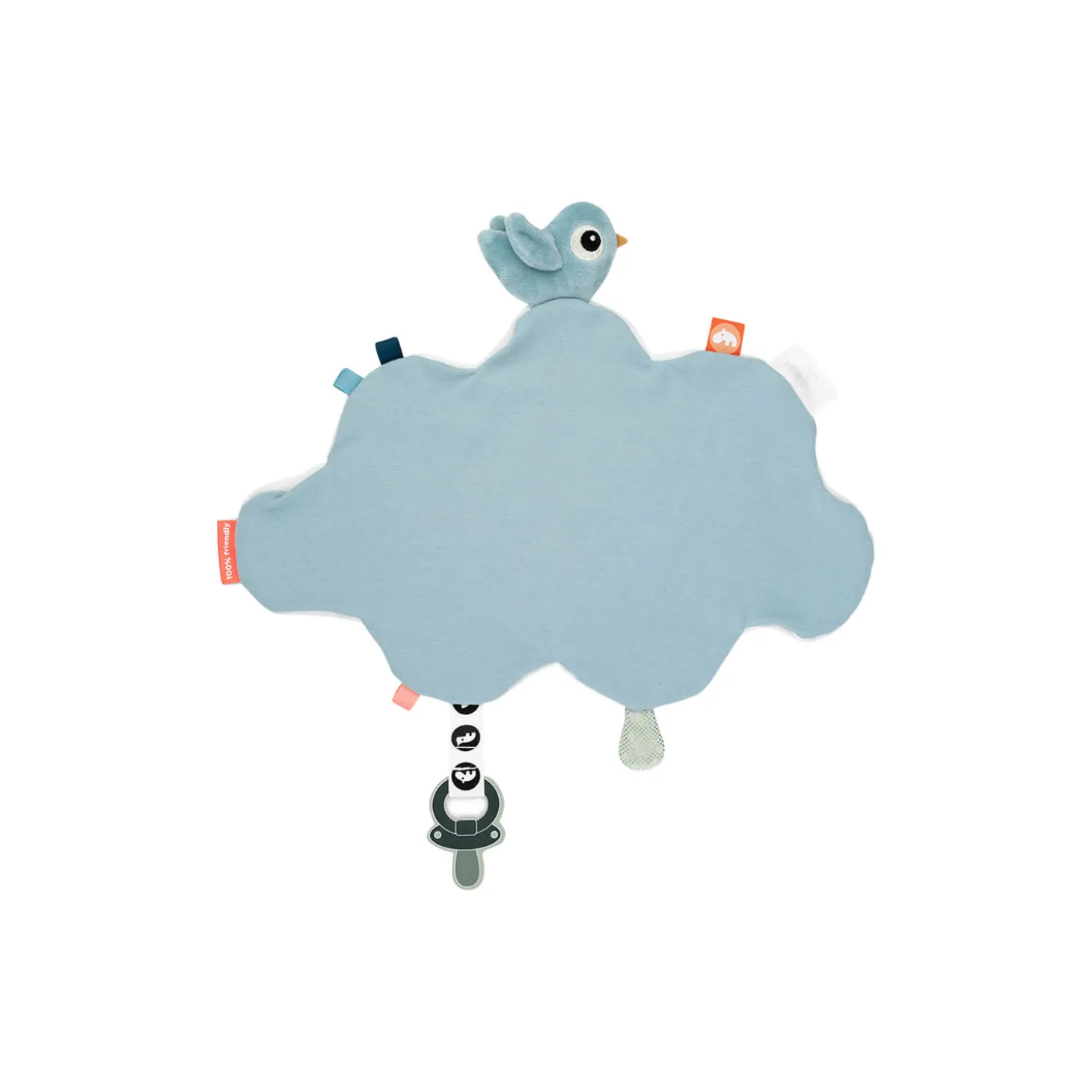 Lad din baby putte med den hyggelige Happy clouds nusseklud. Det lillebitte tæppe er super blødt og behageligt for din baby at holde om, når det er tid til at drage mod drømmeland samt en tryg ven, når I besøger nye steder. Nussekluden er fyldt med sjove mærker og spændende teksturer klar til at blive udforsket. Den lille Birdee laver en knitrelyd, og den praktiske velcrolukning holder på din babys sut. Denne hyggelige sutteklud er formet som en sky med legesyge prikker. En sød blå Birdee holder din baby med selskab, når der nusses.