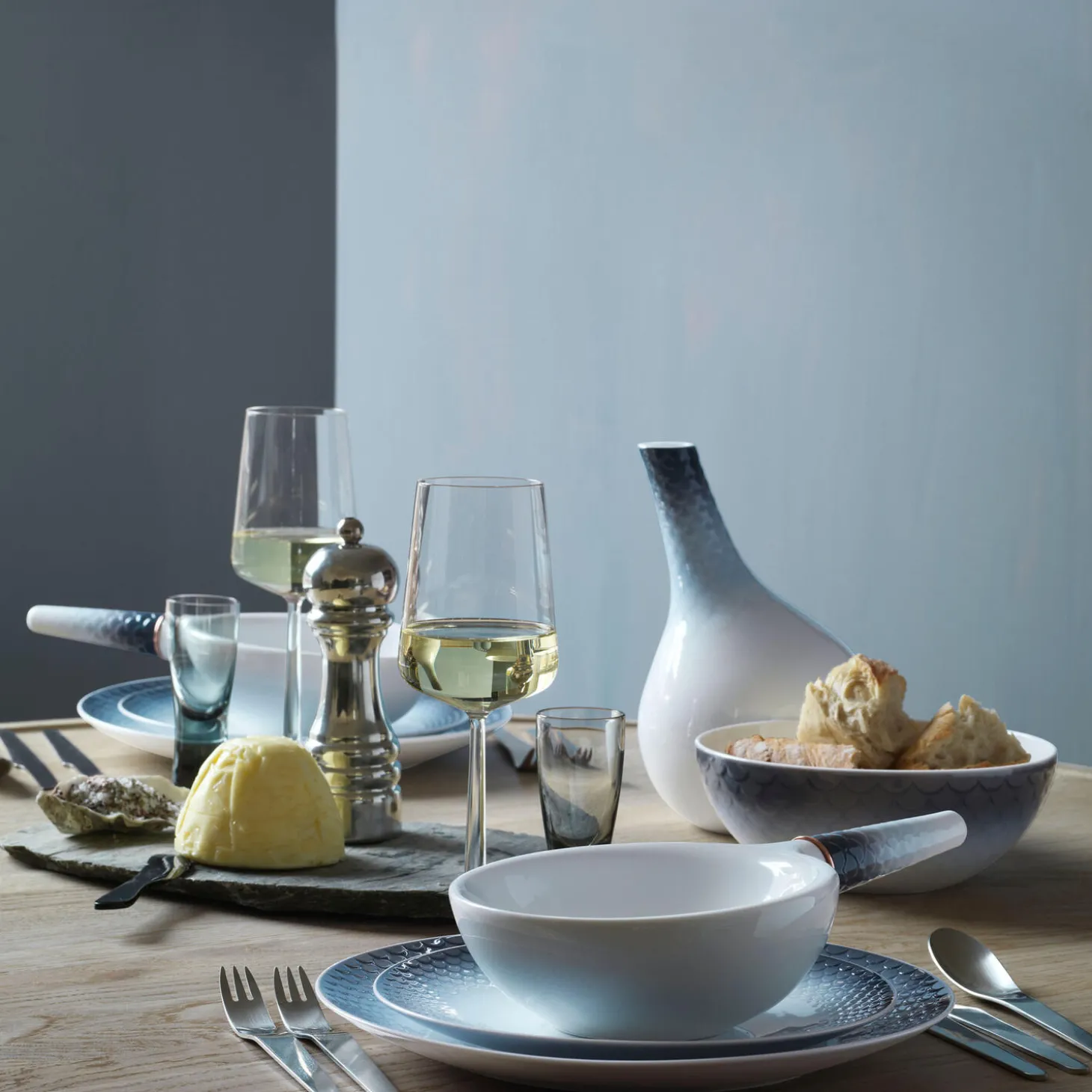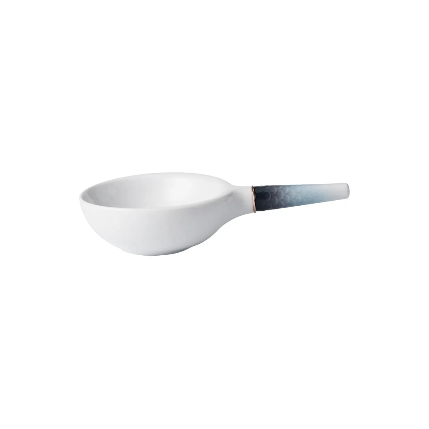 HAV hybridskål i sprøjtemalet porcelæn med bronzedetalje fra Royal Copenhagen. Med arkitektoniske referencer og et unikt formsprog udfordrer HAV Hybridskål på 46 cl den gængse opfattelse af, hvad et porcelænsstel består af. Formen på termoskålen, der er udsmykket med en smuk bronzedetalje, understreger en enkelthed, der baner vej for multifunktionelle serveringsmuligheder. En smuk fiskeskælsdekoration i havets toner pryder skålens håndtag, hvor dekoration og funktion smelter sammen til ét og skaber et bedre greb om produktet. Brug den iøjnefaldende skål som en ny vinkel på både serveringer og portionsanretninger.