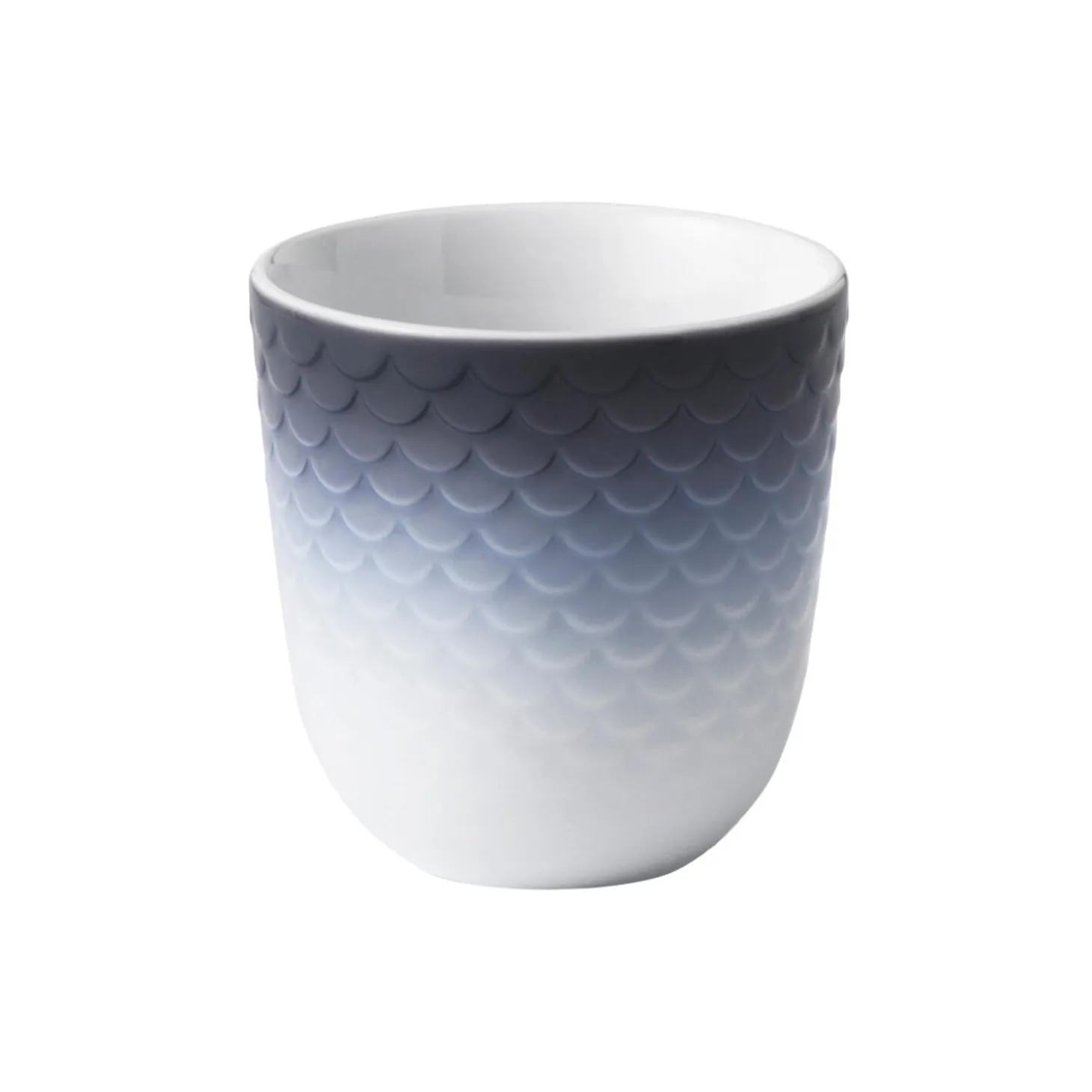 HAV termokop i sprøjtemalet porcelæn fra Royal Copenhagen. HAV Termokop på 27 cl er dekoreret med en iøjnefaldende fiskeskælsdekoration, hvor funktion og æstetik smelter sammen til ét. Krusets farver, der er spraymalet på porcelænet i hånden, henleder tankerne på tågedis over de danske farvande på en tidlig morgen. De taktile fiskeskæl er nøjsomt placeret for at skabe samspil mellem funktion og udsmykning og skaber en særlig termoeffekt og et godt greb om kruset.