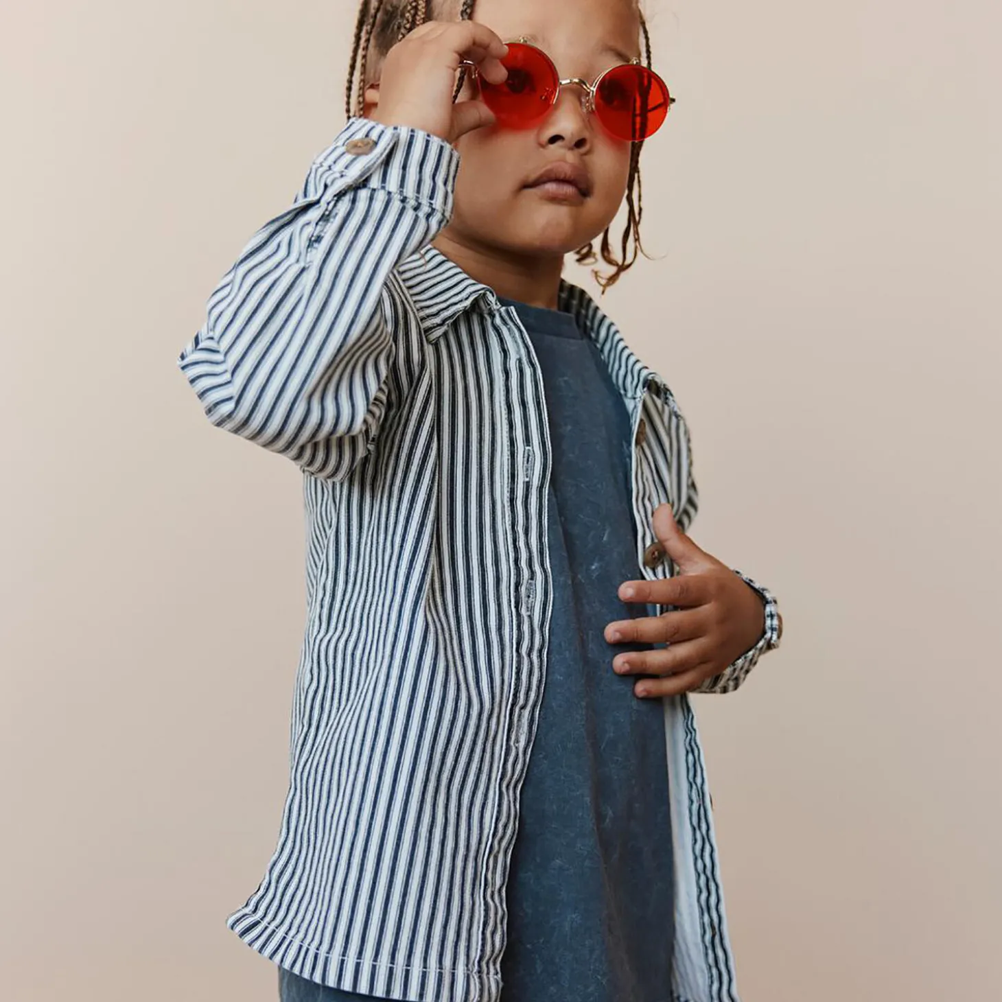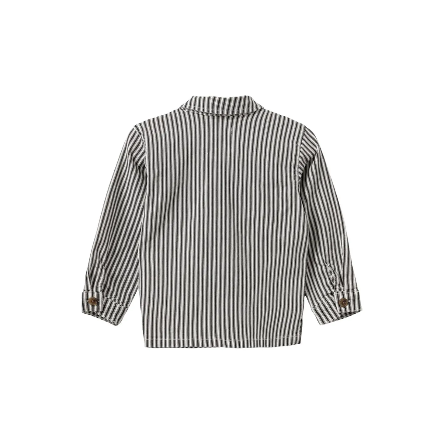Sød deminjakke med sorte og hvide striber. Jakken har en klassisk krave, knaplukning i fronten og en lille lomme med lyn detalje. Fremstillet i en lækker bomuldsblanding.