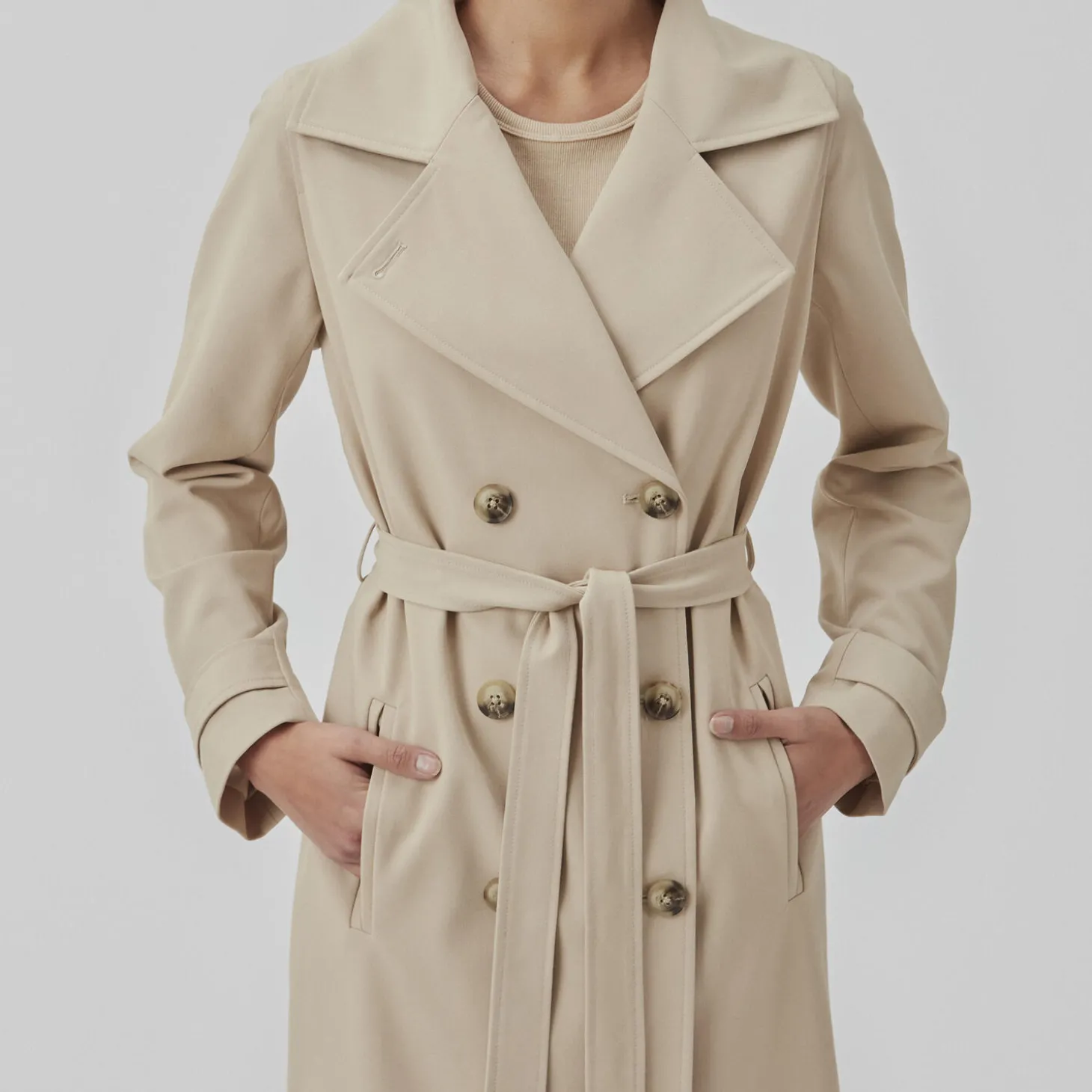 Smuk jakke med i et klassisk udtryk bred krave, bælte i livet og knaplukning. Hiro jacket er perfekt som overgangsjakke fra vinter til forår. Jakken har en rummelig pasform. Vi anbefaler at gå en størrelse ned.