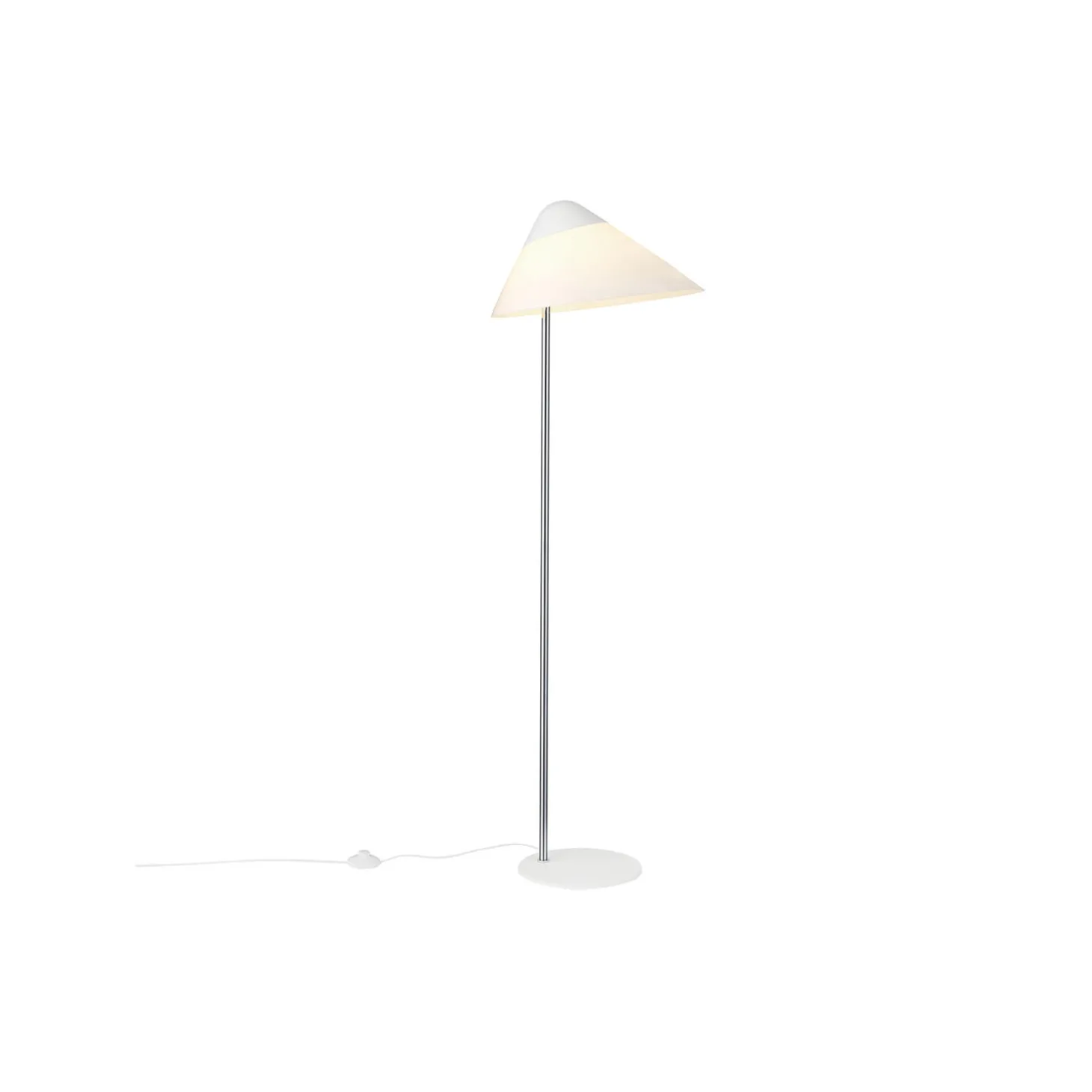 HJW03 Opala Gulvlampe Midi er designet af Hans J. Wegner i 1973 som en del af en større lysserie designet til Hotel Scandinavia i København. Serien præsenterer et markant, nærmest futuristisk udtryk med let skråtstillede lampeskærme og lige linjer. Opala gulvlampe har en asymmetrisk opal akrylskærm med en malet aluminiumtop, der udstråler et behageligt, fokuseret lys, mens den blødt oplyser det omgivende rum gennem lampeskærmen. Velegnet til stue og lounge omgivelser.