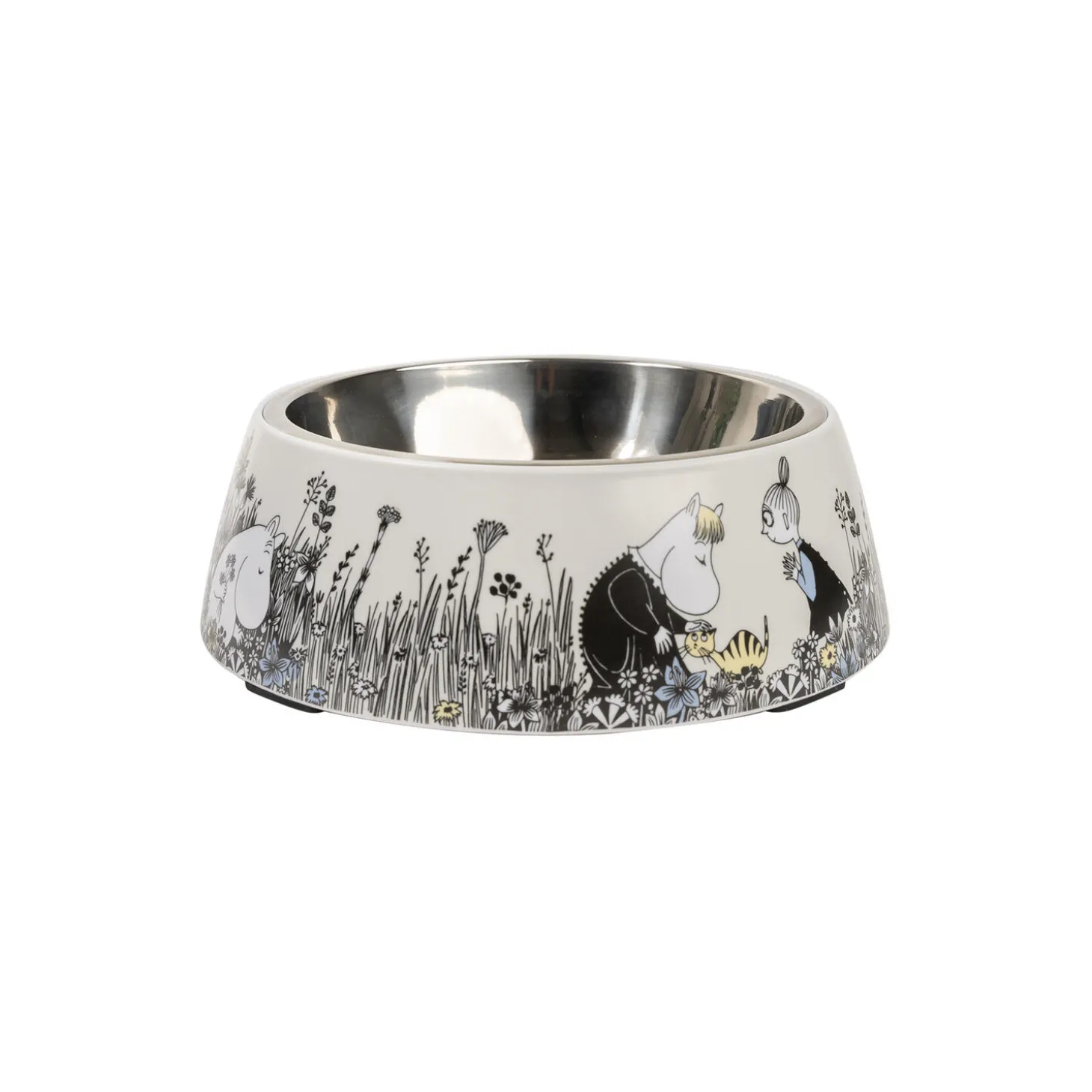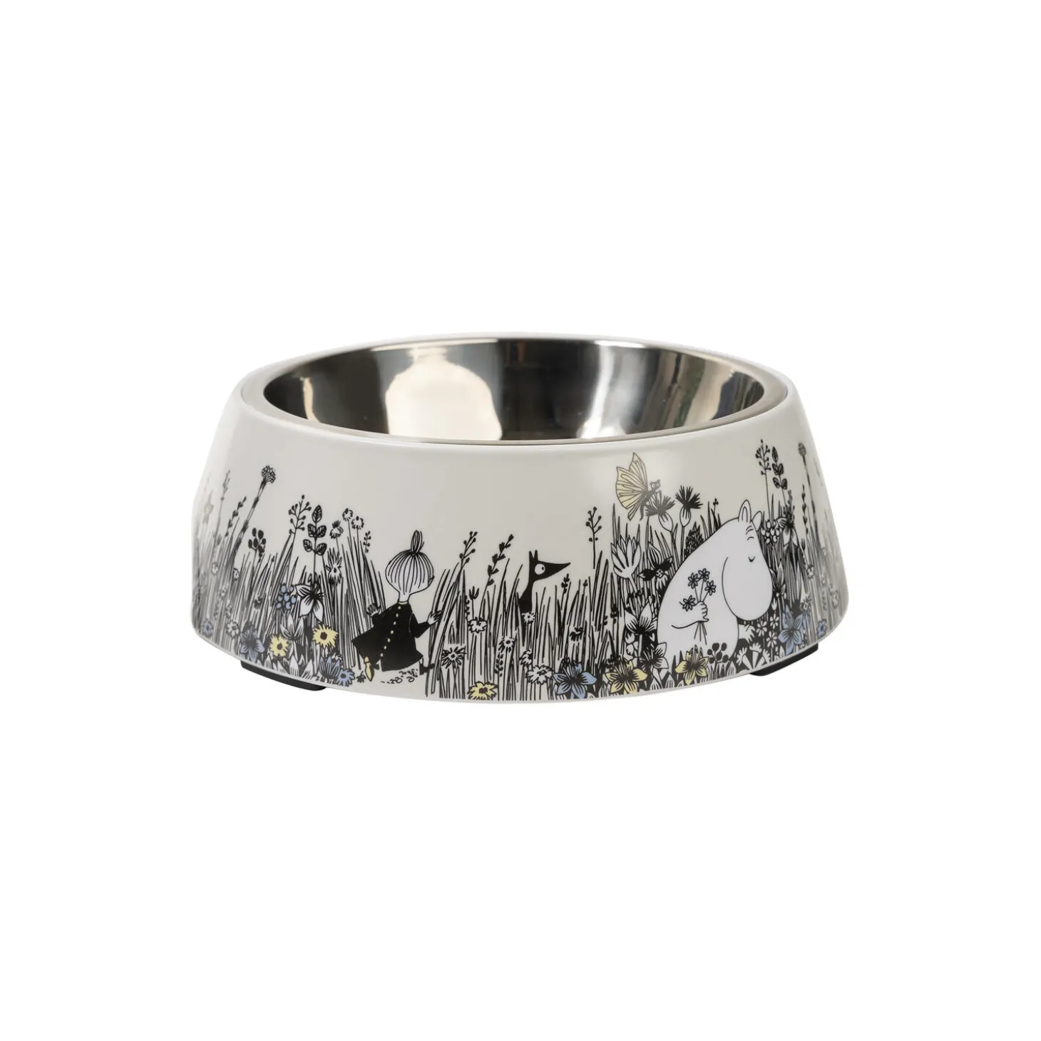 Flot stor grå skål med mumitrolden, mumimor og mumifar og lille my på opdagelse. Kan gå i opvaskemaskinen. Skridsikker bund. Udformet i melamin og rustfrit stål.