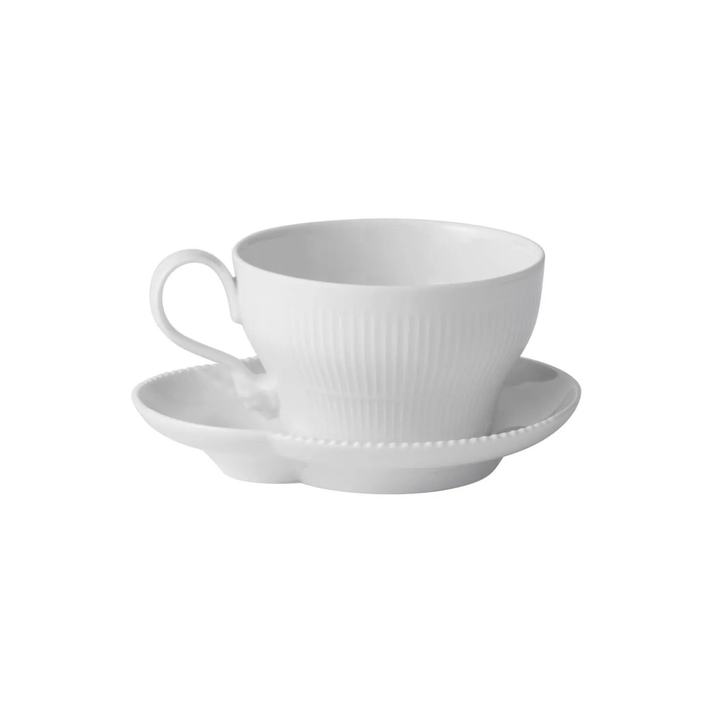Hvid Elements kop med underkop i porcelæn fra Royal Copenhagen. Med sit organiske formsprog og unikke, håndlavede detaljer er den smukke Hvid Elements 26 cl kop og underkop en helt særlig tilføjelse til din samling af kopper og krus. Underkoppens charmerende form inviterer til at placere en lille småkage eller andet sødt ved siden af din kaffe eller te. Ud over et formsprog ud over det sædvanlige er koppens hank prydet af en ansigtsformet dekoration, en såkaldt grotesk.