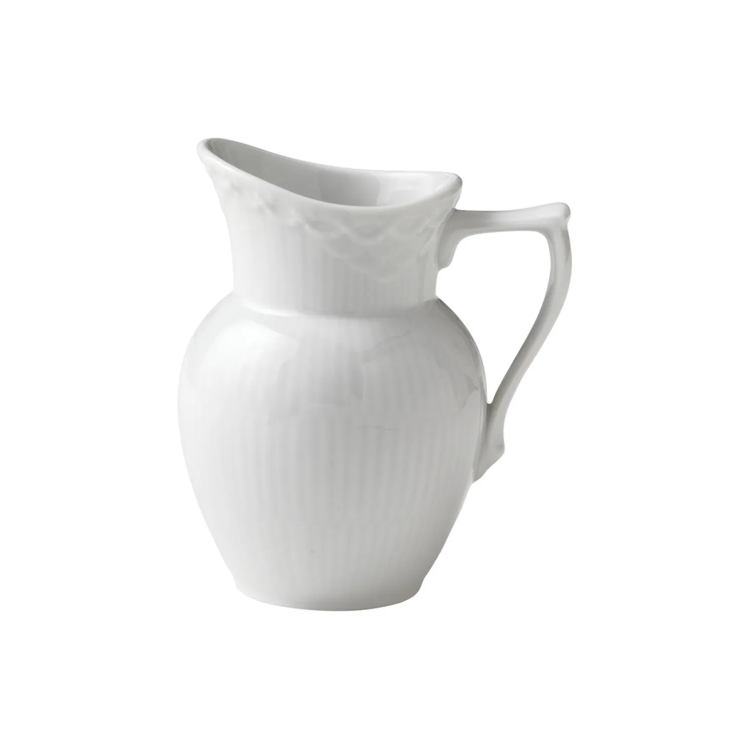 Hvid Halvblonde flødekande i porcelæn fra Royal Copenhagen. Den charmerende Hvid Halvblonde Kande har en smuk, riflet overflade og på kandens kant pynter en fin, håndlavet blonde. Porcelænskanden på 17 cl er ideel som mælkekande og flødekande, men kan også rumme andre væsker så som dressinger til sprøde salater.