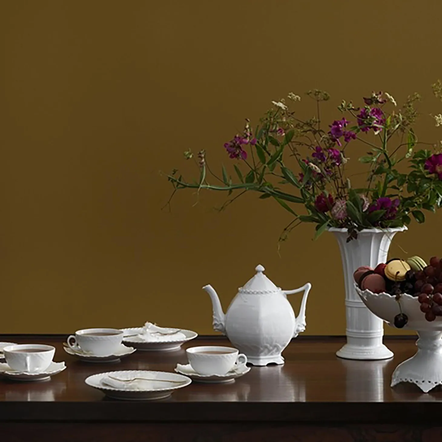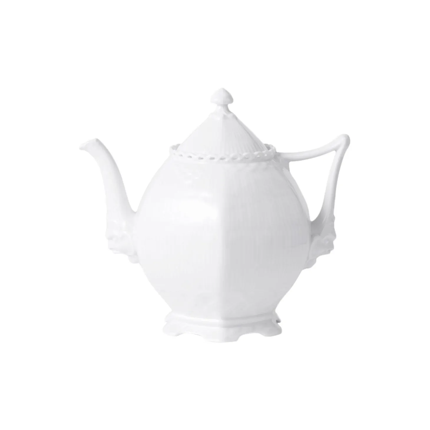 Skab en romantisk bordopdækning i et rent udtryk af hvid porcelæn med denne Hvid Helblonde Tekande på 100 cl. Tekandens ubemalede porcelæn fremstår med en særlig detaljerigdom af håndudskårne ornamenter og en rund blondekant, som skaber et modspil til den kantede krop. Tekanden løftes op fra bordet af en smuk søjlefod, mens det spidse låg prydes af et lille sneglehus. Hank og tud vokser fra to historiske Royal Copenhagen ornamenter, der kaldes grotesker og som skaber et overraskende modspil til den delikate steldel. Hvid Helblonde er fortællingen om et stel med så mange skulpturelle kvaliteter, at det kunne stå alene med sin ubemalede og romantiske overflade. Stellets kantede design prydes af blonder omhyggeligt udstukket i hånden for derefter at blive glaseret af dygtige håndværkere.