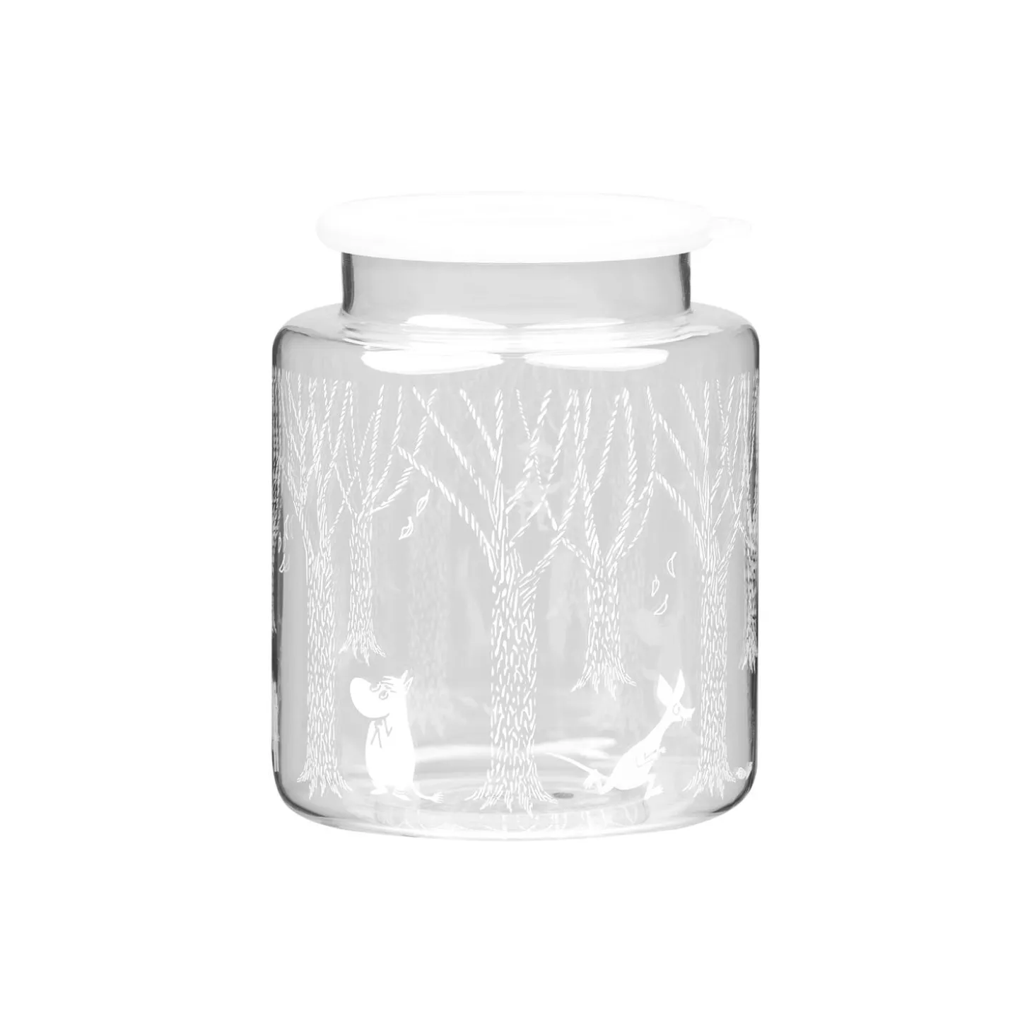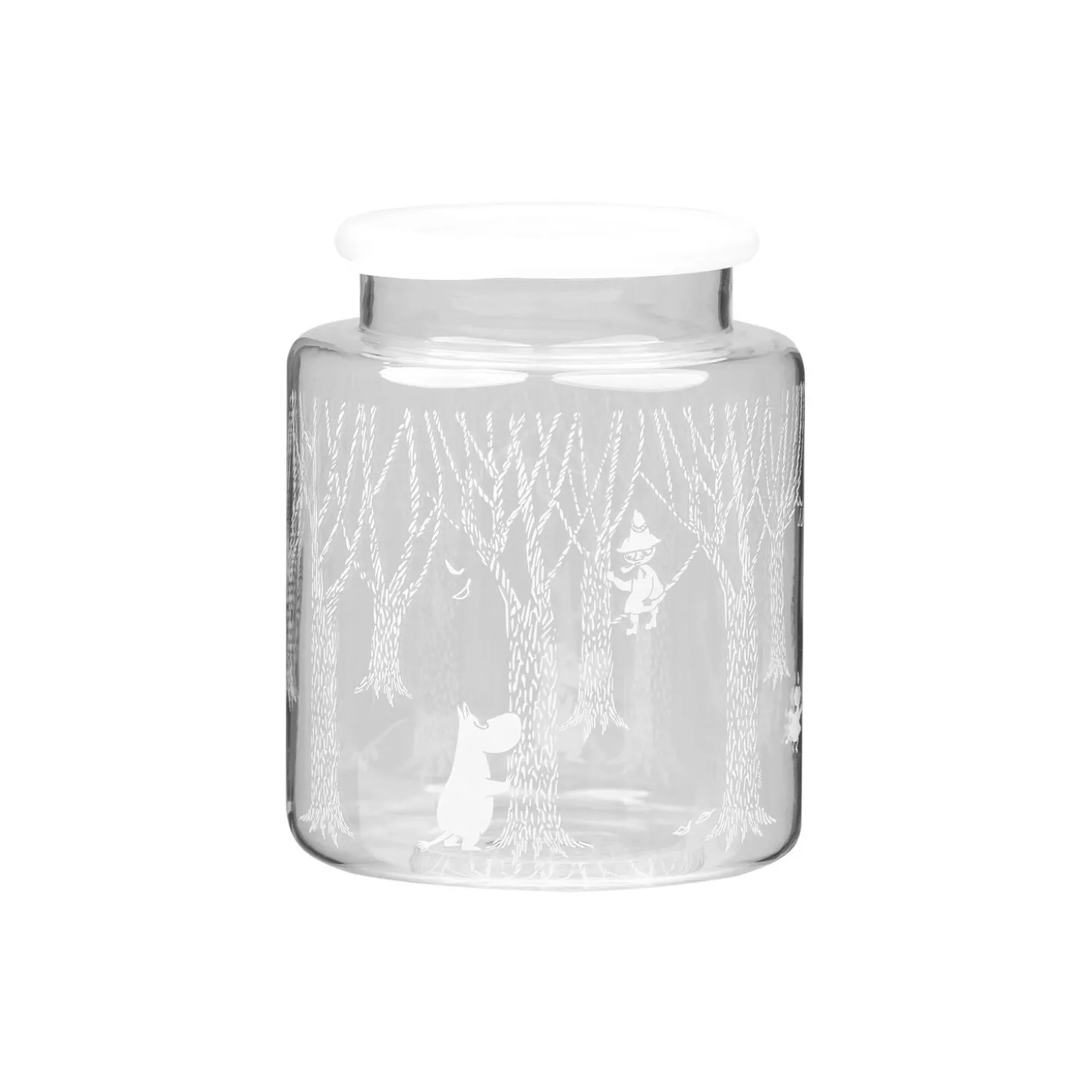 There is so much to be discovered in the forests of Moomin valley. As the season is changing from autumn to winter, the moonlight creates twisty, dark shadows in the evening. Next morning brings a new surprise, as the mist has frozen to frost on the tree trunks. Winter has sent its first regards. The handy glass jar is suitable for storing treats, fruit, or biscuits. Why not even fill it with ribbon lights to create a cozy atmosphere? Handmade from high quality, lead-free glass.