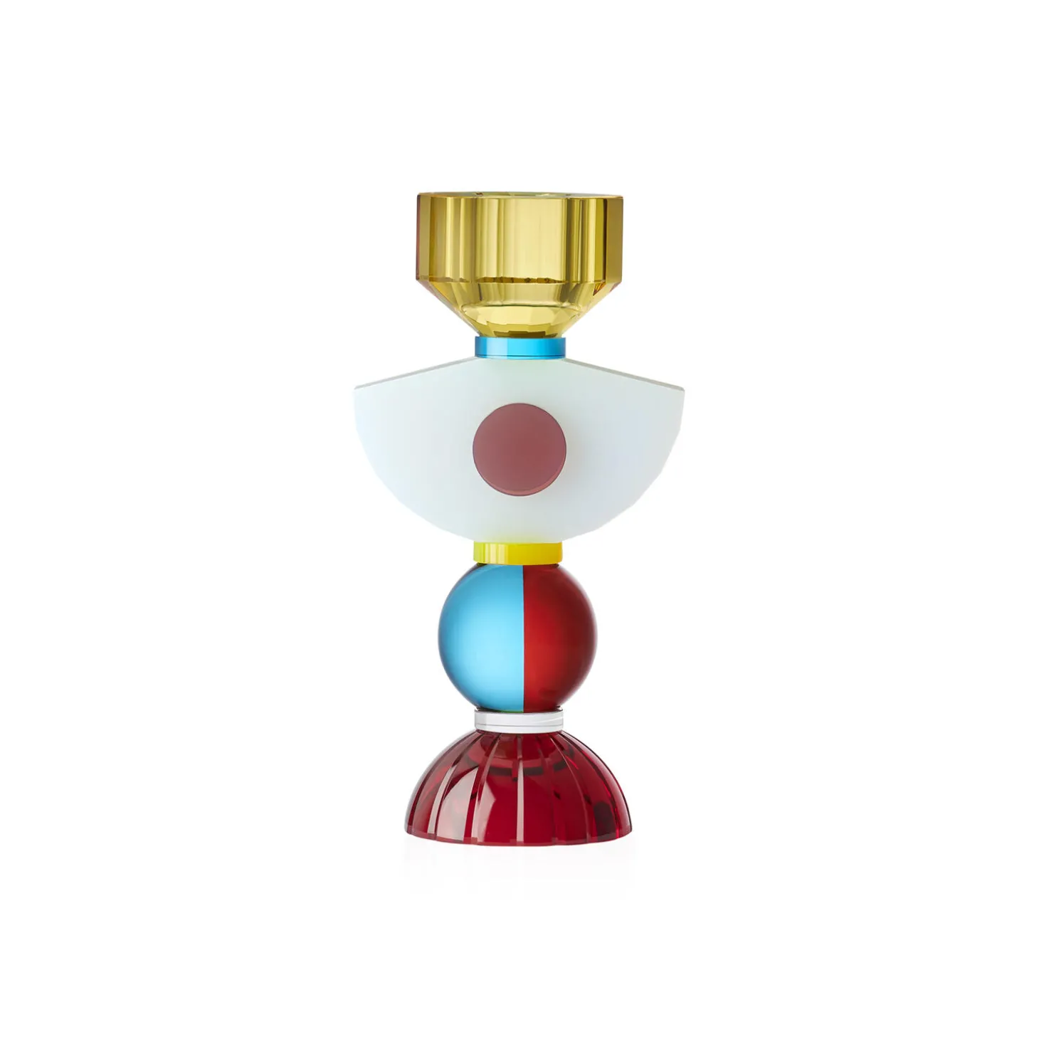 Dette spændende fyrfadsstage er designet for at skabe en fængslende effekt. Med en rubinrød krystalbase, stablet med en himmelblå og orange kugle, toppet med en opalkugle og afsluttet med en ravfarvet lyseholder, er dette stykke virkelig stimulerende. Det er en hyldest til det håndværk, der er brugt til at skabe dette stykke.