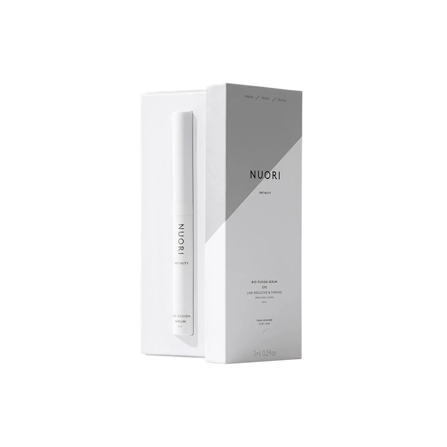 NUORI’s intensive Bio-Fusion Eye Serum er specifikt designet til at adressere universelle tegn på ældning ved den sarte hud omkring øjet. Denne lette serum, der er formuleret med den seneste generation af naturlig hyaluronsyre booster, udfylder synligt fine linjer. Ceramider med høj biotilgængelighed understøtter fornyelse og genopbygning af hudens naturlige beskyttende barriere og forhindrer yderligere fugttab. Ekstrakt af brunalger tilbyder effektiv antioxidant beskyttelse og er en hudforstærkende ingrediens, mens koffein kontrollerer mikrocirkulationen og forhindrer dermed mørke rander samtidig med fugttilførslen til hudens ydre lag er sikret. Den keramiske applikator afkøler huden og forhindrer væskesamling omkring øjnene. Duftfri.
