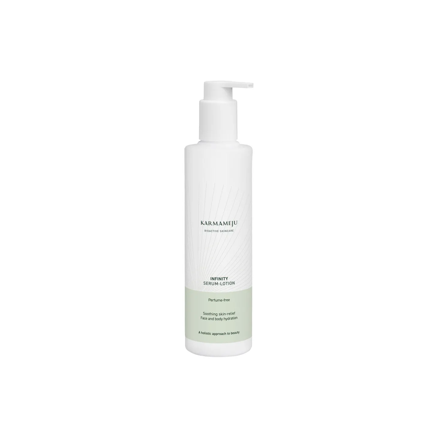 INFINITY face & body serum-lotion er let absorberende og dybt fugtgivende pleje til ansigt og krop – 365 dage om året. INFINITY er parfumefri og dermatologisk testet til sensitiv hud, til hele familien og til dem, der ønsker parfumefri hudpleje, uden potentielle duftallergener. Med en naturligt forekommende, sanselig duft af bæredygtigt produceret oliven, aloe vera og figenkaktus fra de italienske marker hos Karmamejus bæredygtigt certificeret leverandør. Multifunktionelle INFINITY er formuleret med styrkende antioxidanter, fugtgivende hyaluronsyre, økologisk aloe vera, samt lindrende kamille- og calendulaekstrakt, som hjælper med at berolige huden. INFINITY face & body serum-lotion er formuleret med en Skin-relief Complex af kapers-, figenkaktus- og olivenekstrakt, som er klinisk dokumenteret for at have en lindrende og antioxidant-effekt, der beroliger og aktiverer hudens naturlige immunforsvar. Anvendelse: Anvend INFINITY dagligt, eller efter behov på krop og ansigt. Ansigt: Anvend som serum under dagcreme/solcreme, som let dagcreme og/eller i et tykt lag som en hydrerende fugtmaske til natten. Krop: Anvend som let-absorberende fugtpleje efter behov. Kombinér med bodylotion eller body oil, for at opnå dybt nærende pleje.