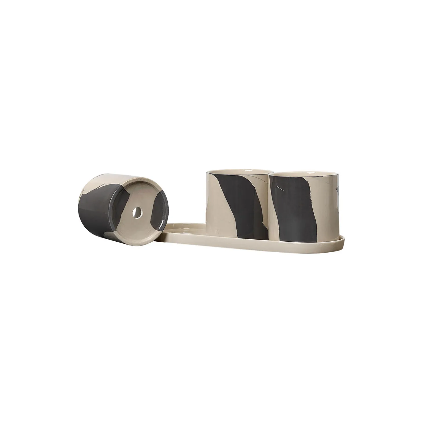 Inlay-serien er fremstillet af stentøj, der består af en særlig tofarvet lerblanding for at skabe et stort marmorlignende mønster – som er unikt i hver enkelt stykke stentøj. Inlay Herb Pots består af tre potter med drænhuller og en underkop, der giver din vindueskarm i køkkenet et elegant udseende, og hvor du kan vise alle dine uundværlige urter frem.