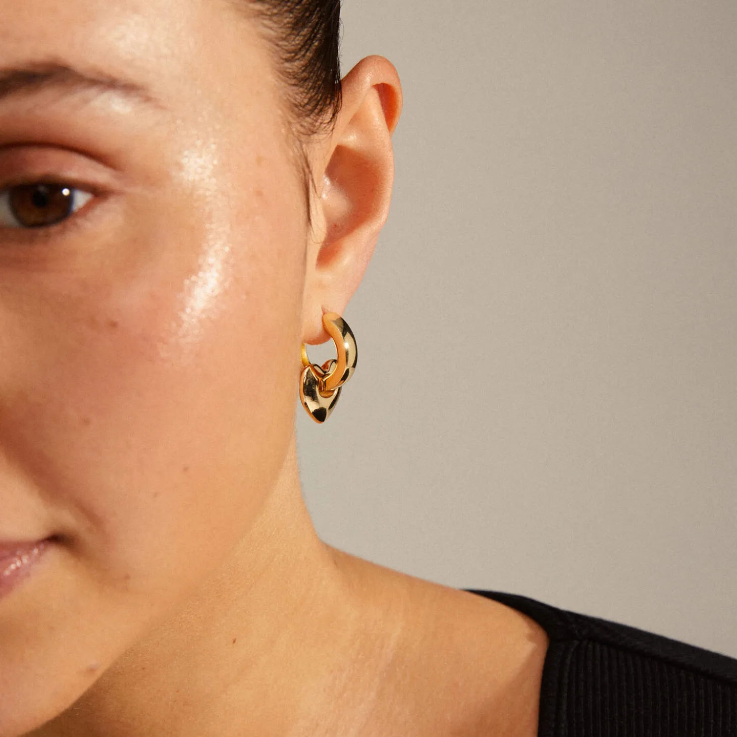 Hold on to your heart, med Pilgrims guldbelagte øreringe fra IOKASTE-serien! Brede shiny hoops med chunky hjertevedhæng, der kan tages af eller på, alt efter occasion. Øreringene har en easy-to-use kliklås og er lavet af 99% genanvendt materiale.
