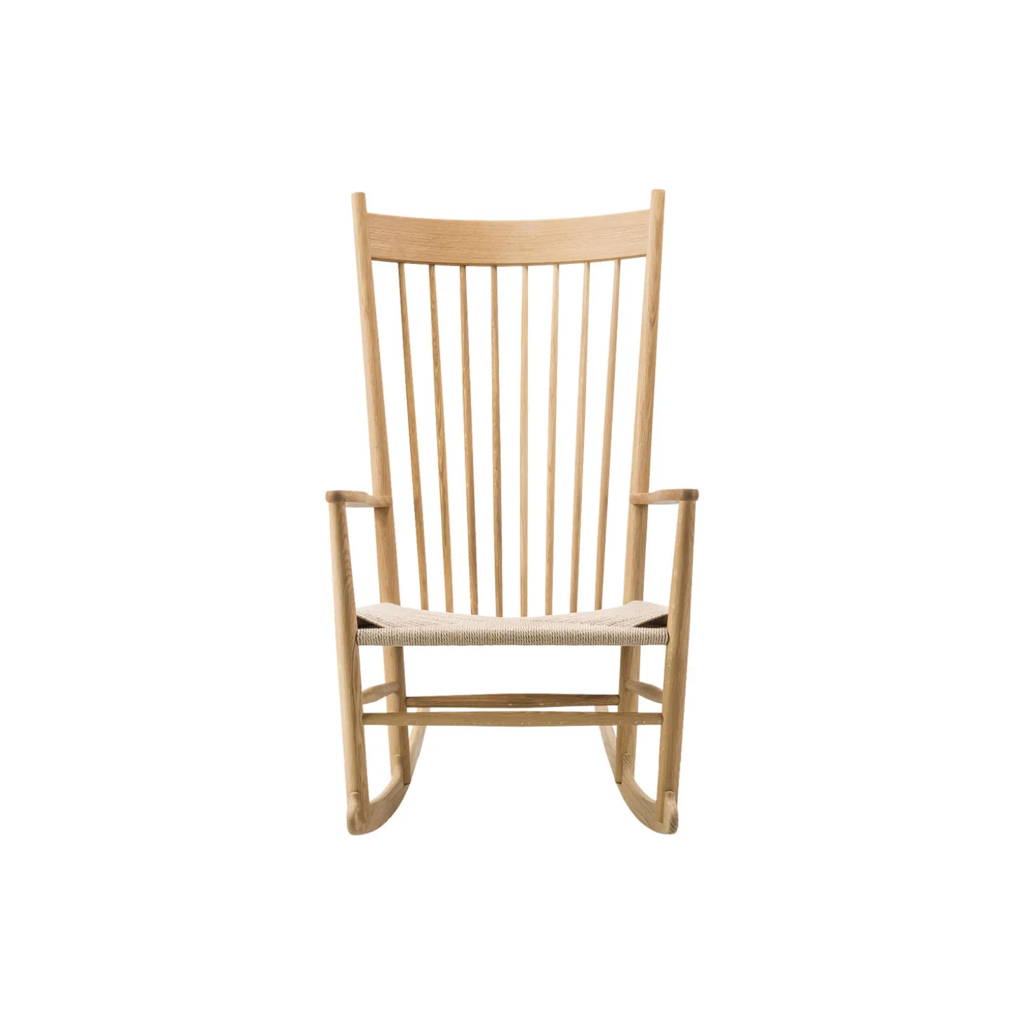 J16 gyngestol i lysolieret eg med sæde i papirgarn fra Fredericia. Farve: lysolieret eg/natur. Mål: H: 107 x B: 62 x D: 93 cm. Siddehøjde: 42 cm. Design: Hans J. Wegner.