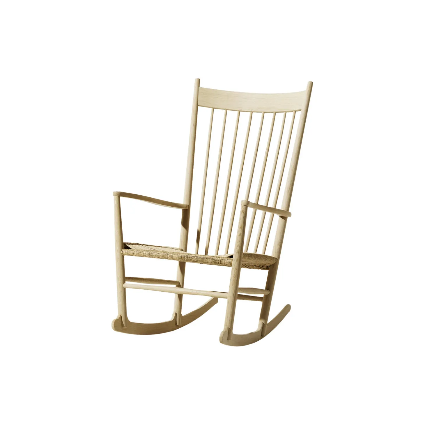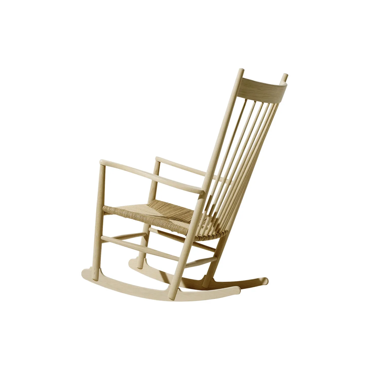 J16 gyngestol i sæbebehandlet eg med sæde i papirgarn fra Fredericia. Farve: sæbebehandlet eg/natur. Mål: H: 107 x B: 63 x D: 93 cm. Siddehøjde: 42 cm. Design: Hans J. Wegner.