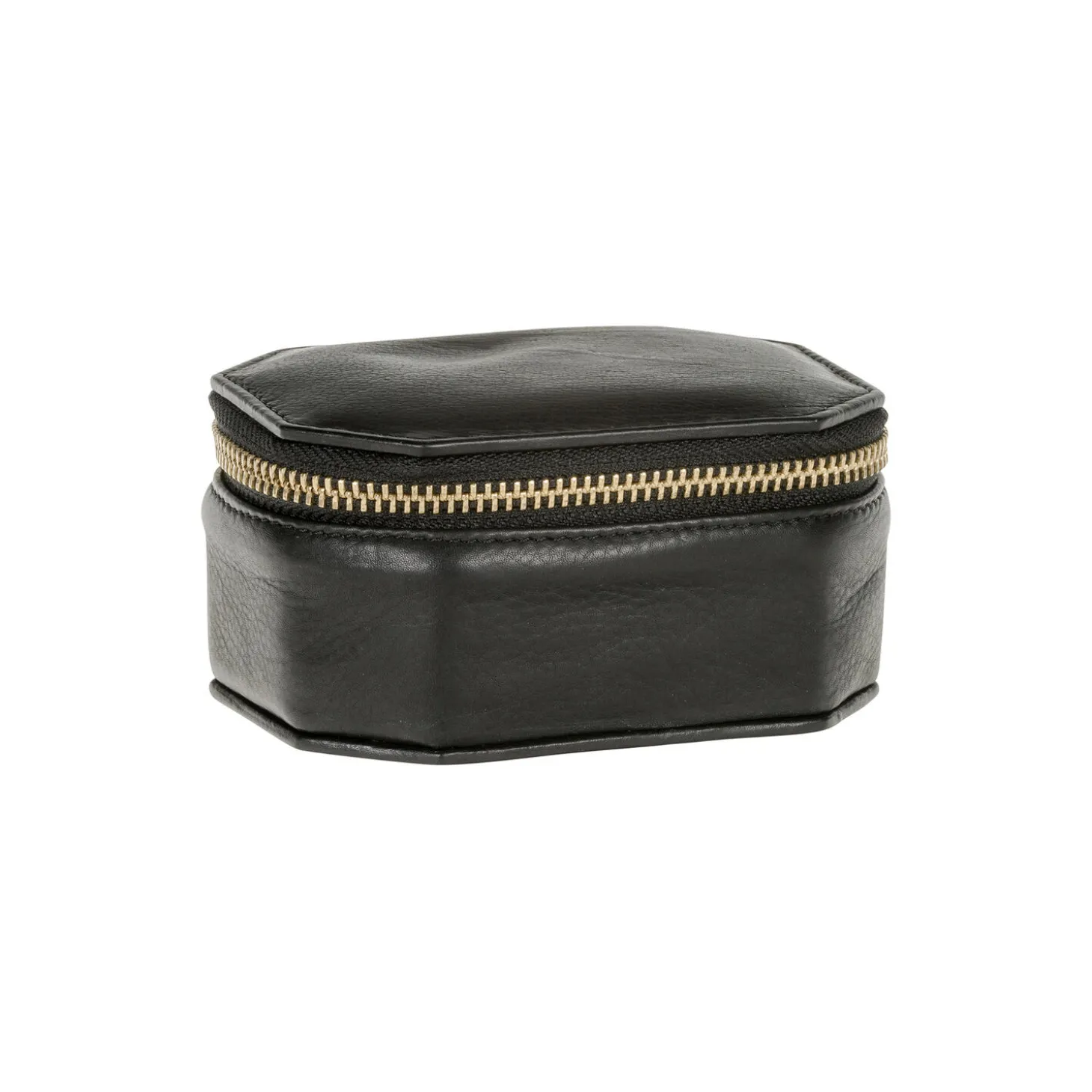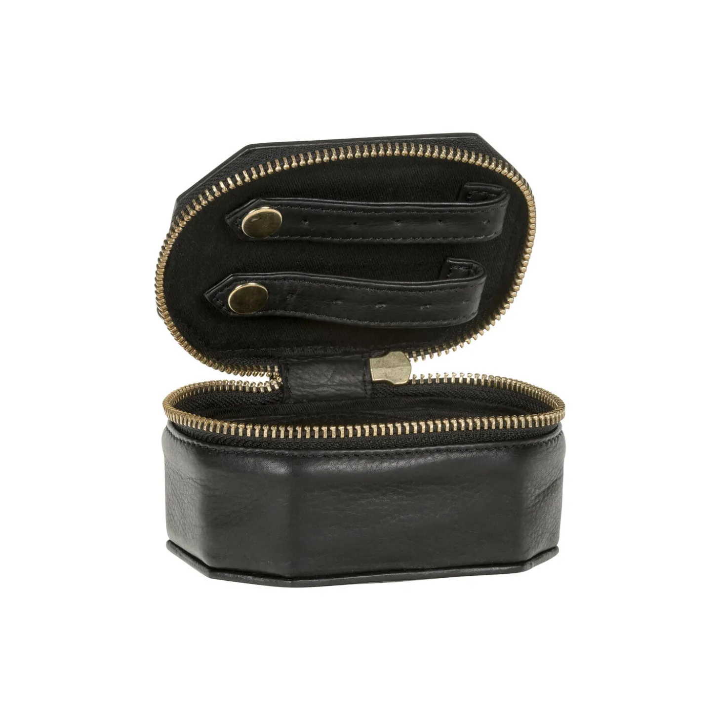 Medium smykkeboks i blød og lækker skindkvalitet. Skøn som dekoration på badeværelse og god at have med i f.eks. sportstasken eller kufferten. Smykkeboksen lukkes i toppen med lynlås lukning. Indvendigt: Smykkeboksen indeholder 2 stropper til øreringe og ringe og 3 separate lommer til halskæder mv.n.