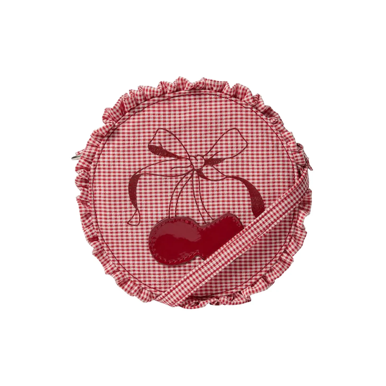 Rund taske med kirsebær print på front med rød/hvid ternet stof. Tasken har justerbar rem.